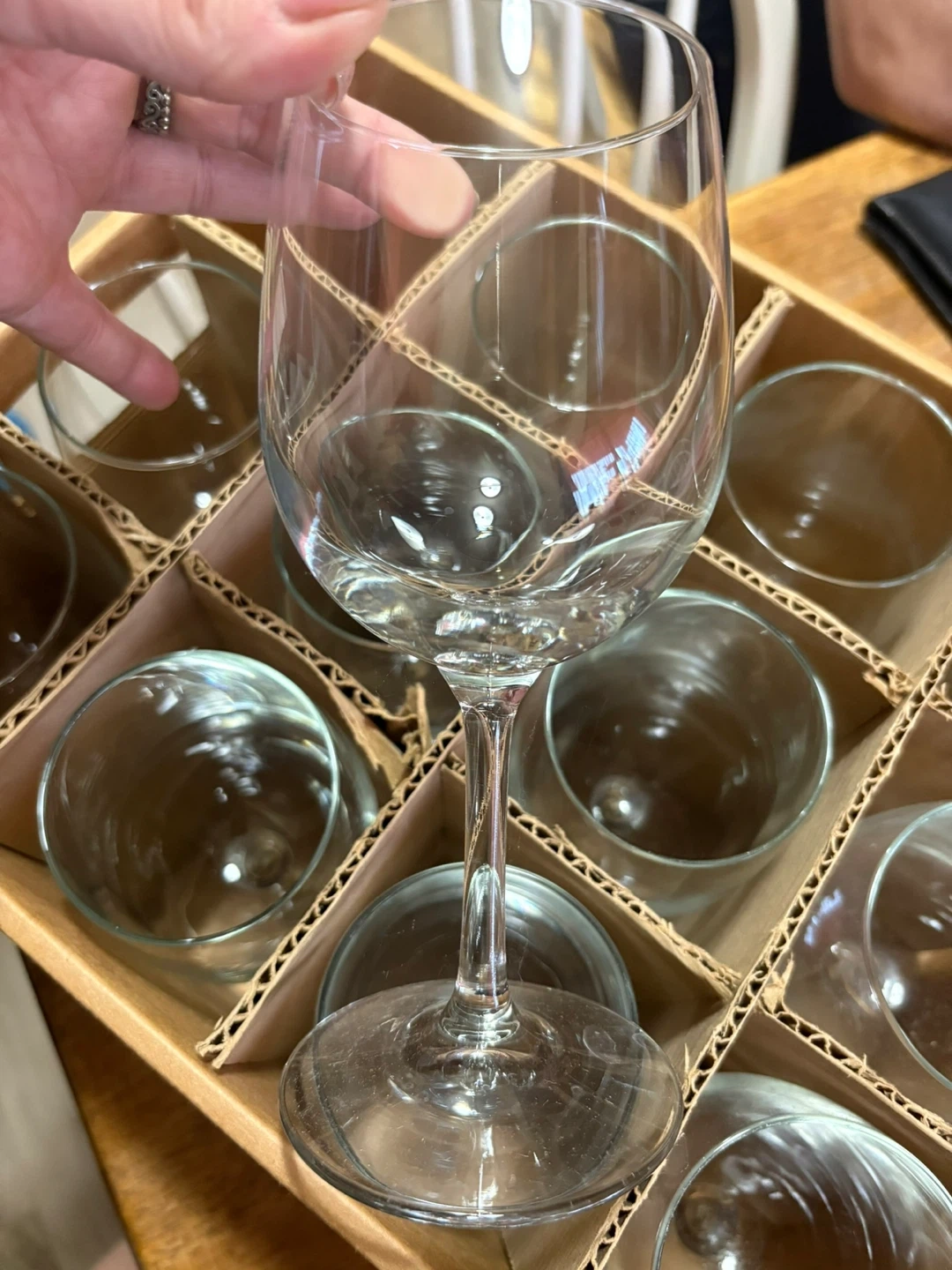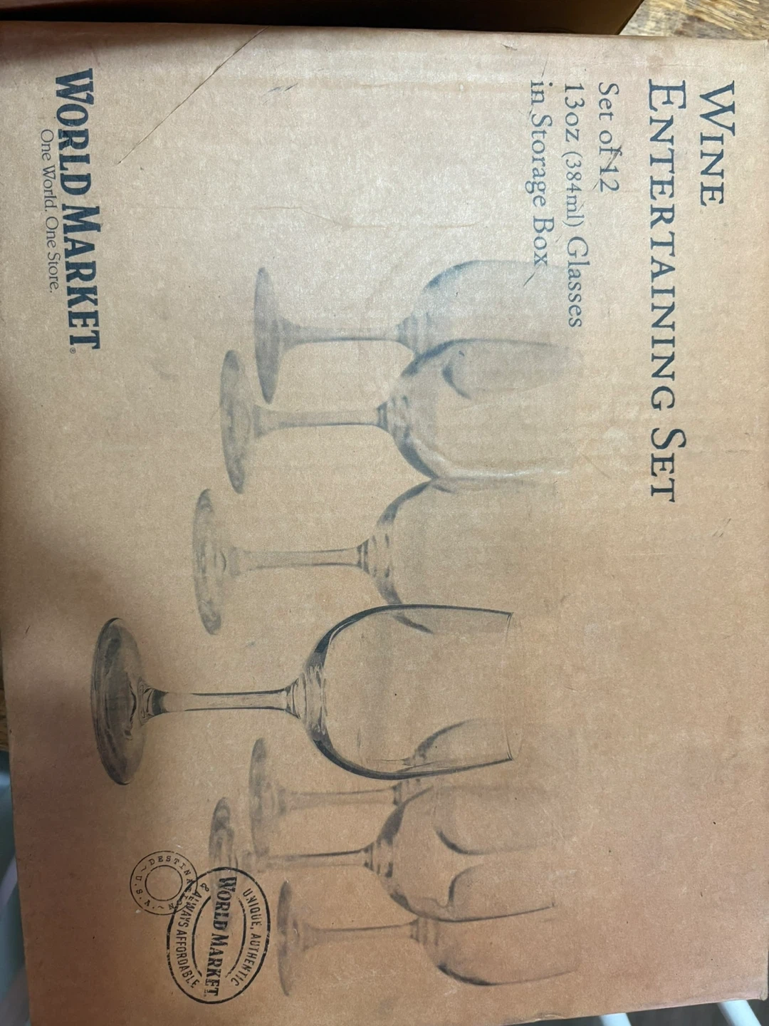 Selling a set of 12 World Market wine glasses! They are 13oz (384ml) glasses and come in a storage box. Perfect for entertaining!