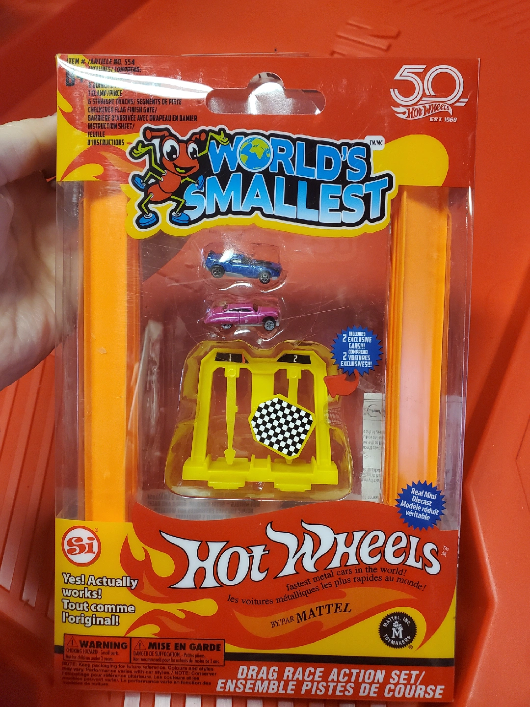 60Get ready to race with the World's Smallest Hot Wheels Drag Race Action Set! This miniature set is brand new and ready for some high-speed fun. It actually works just like the original, so you can enjoy all the thrills of a drag race in a tiny package. package was opened and taped back together, see photo.