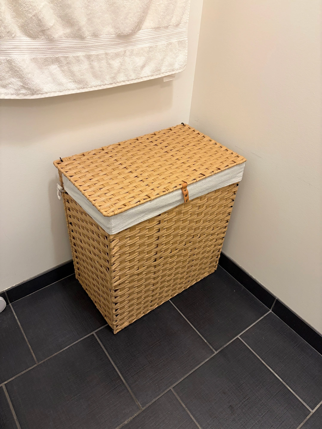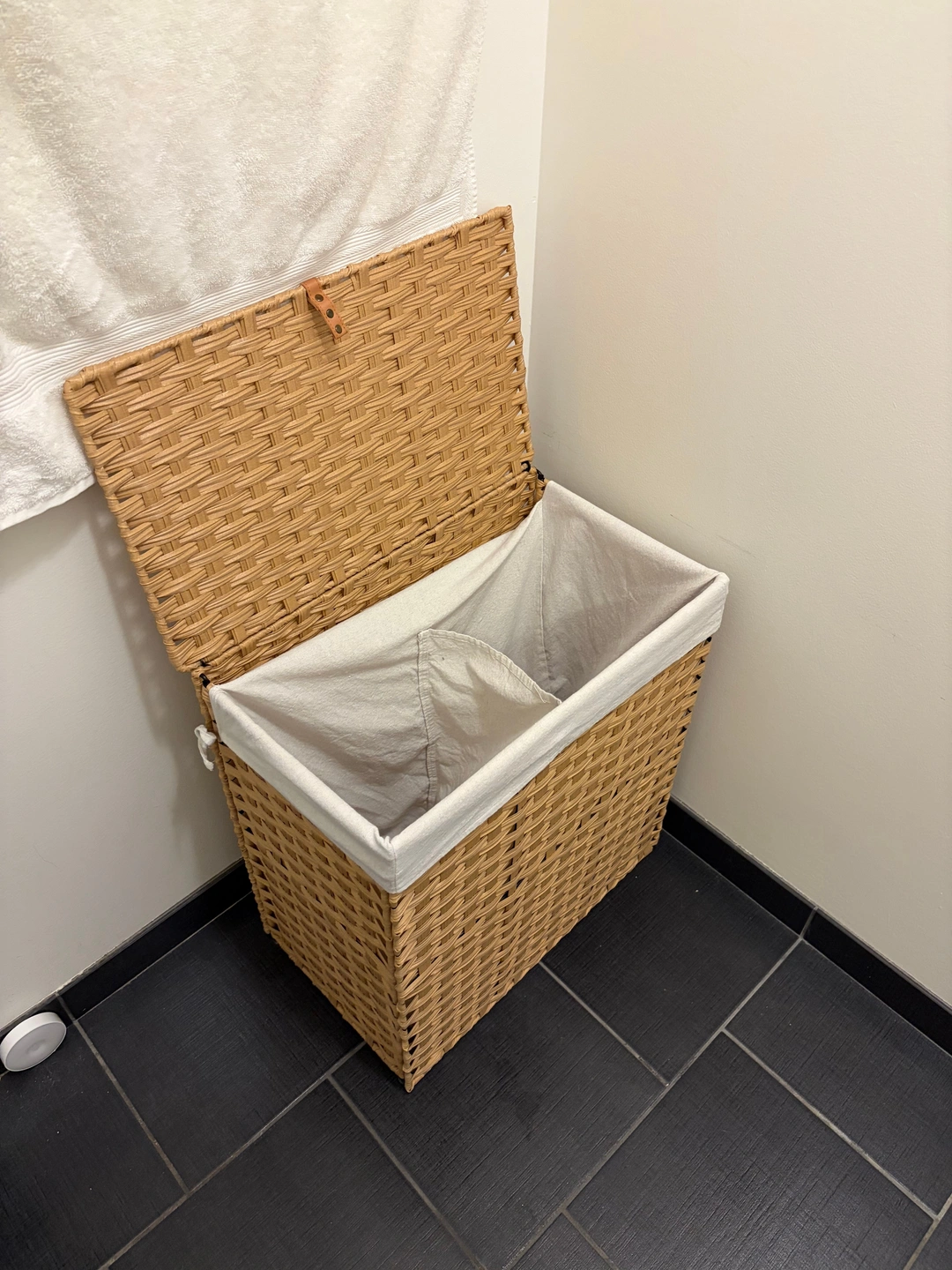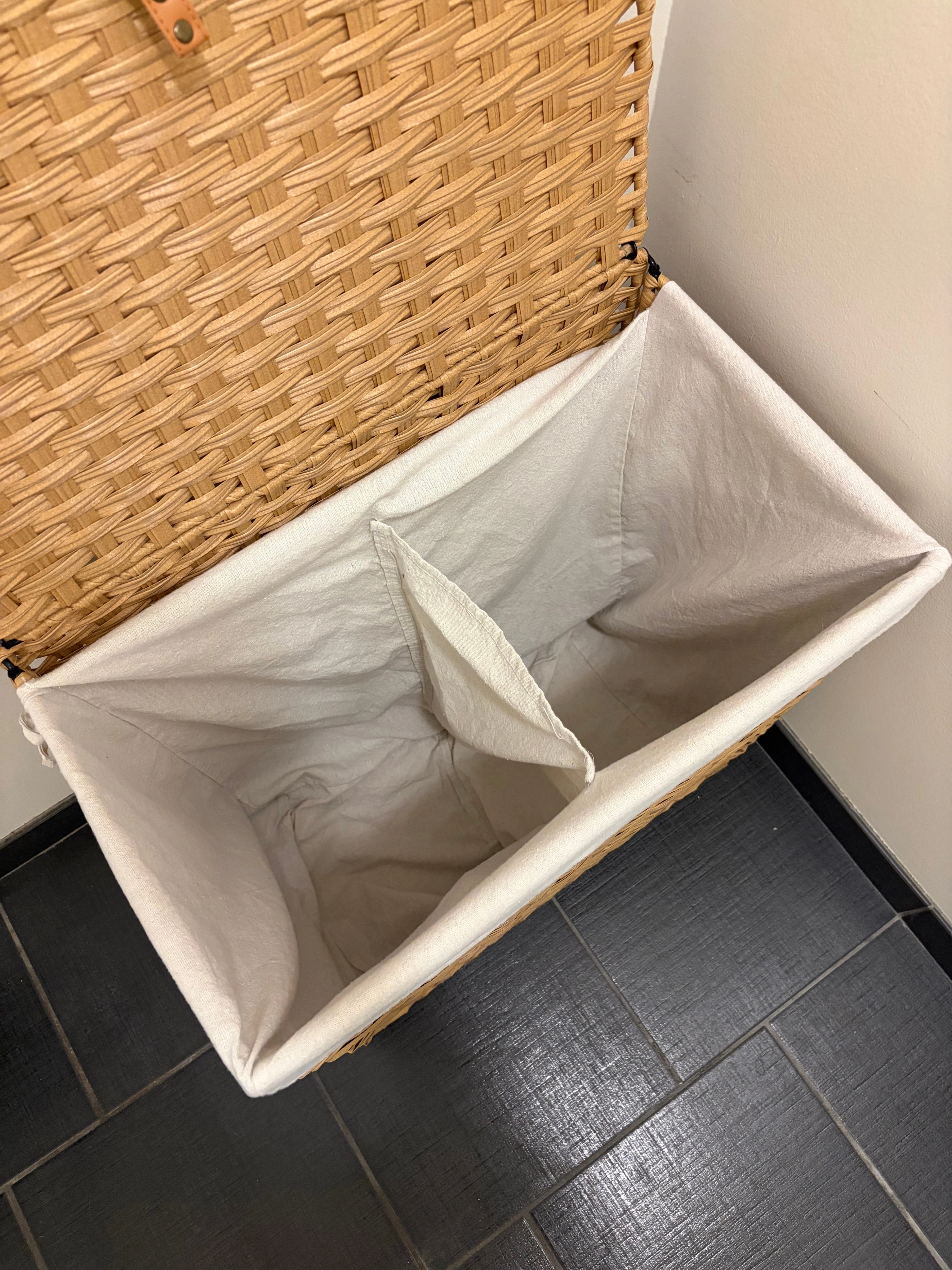 55Woven laundry basket with 2 removable liner bags and sturdy handles. Neutral two-tone design (white and light brown) that fits any style. Folds down flat for easy pickup or storage. Great for bedroom, bathroom, or laundry room. Size: 22.2" W × 12" D × 24" H (56.5 × 31 × 61 cm) Capacity: 110L – ideal for small families (2–3 people). Max Load: 99 lbs / 45 kg. Bonus: Perfect for sorting white and colored laundry separately with two liners. Condition: Gently used, less than 2 years old. Liners have been freshly washed and are ready to use. Basket is clean and in excellent shape — no stains, tears, or damage. Original Price: $50. Asking Price: $25 OBO Pickup: Local pickup only in Lake View East / Wrigleyville. Lightweight and easy to carry; folds flat to fit easily in a car. Payment: Cash or Venmo