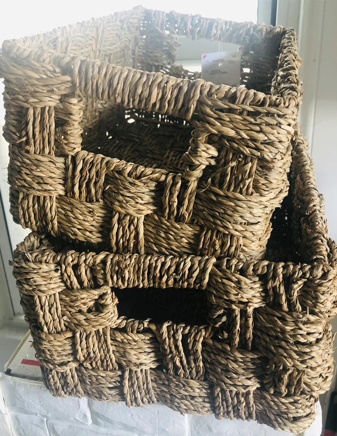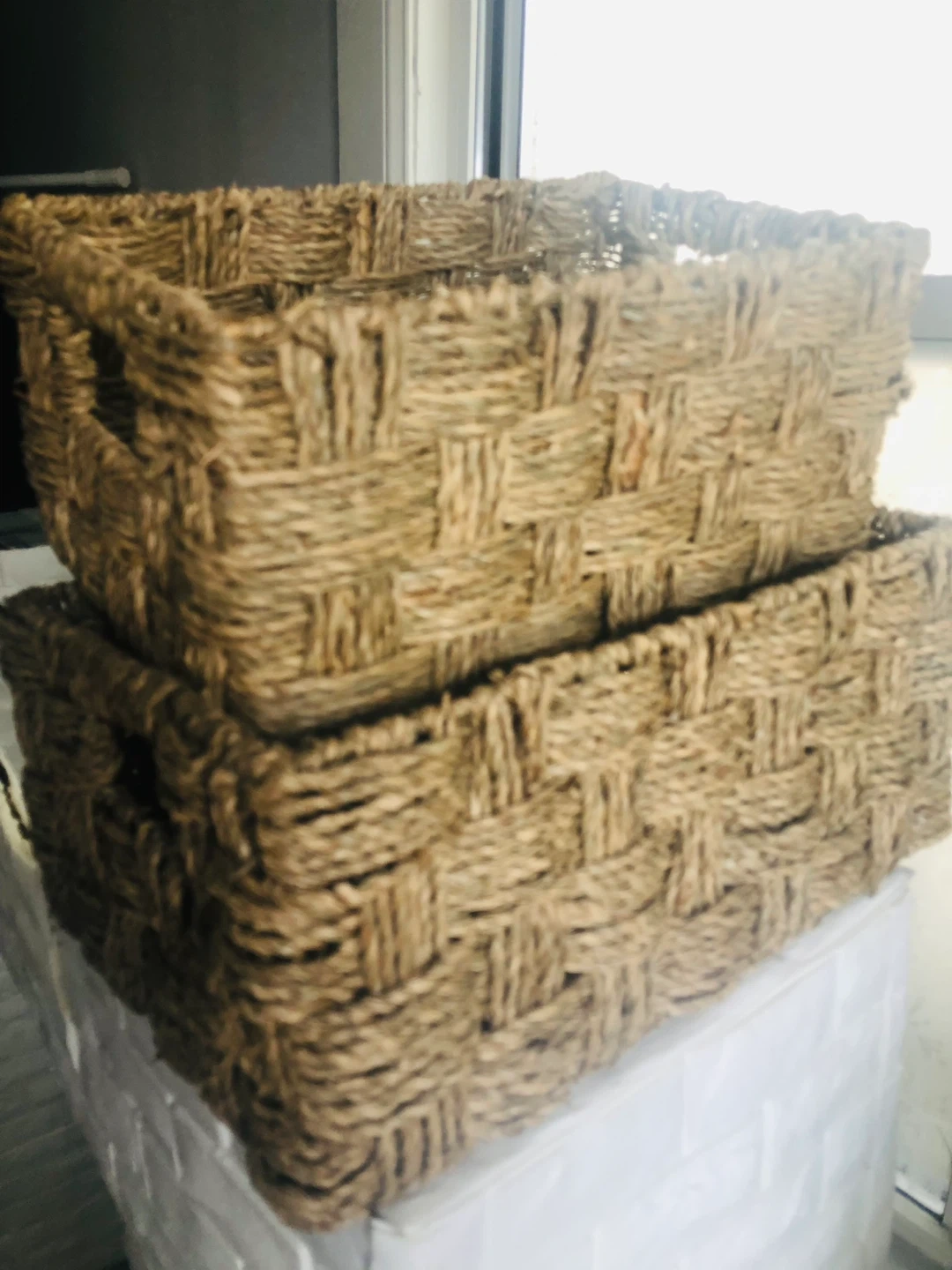 I'm selling a set of two woven seagrass storage baskets. They're great for organizing items around the house. The baskets are in good condition and ready for a new home!