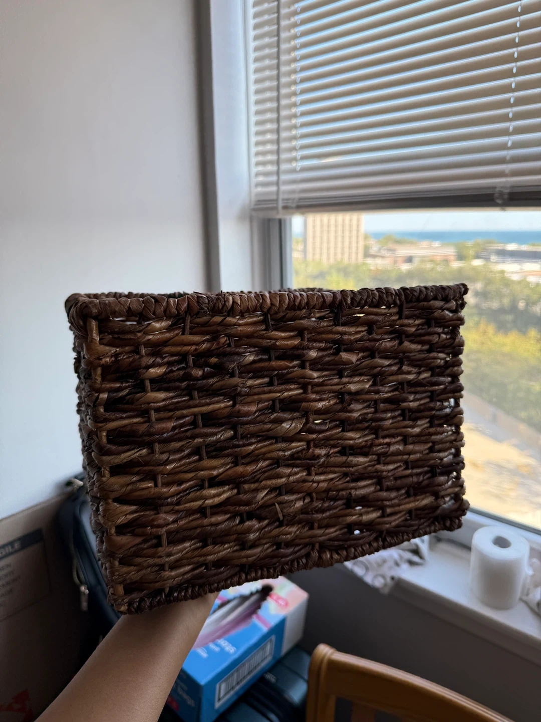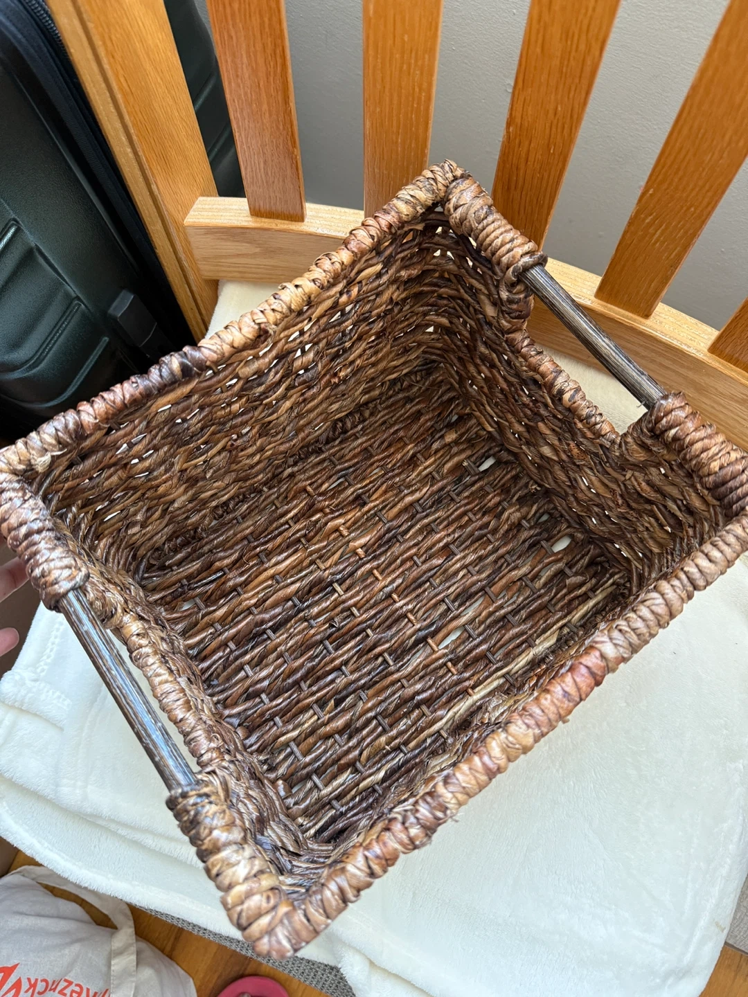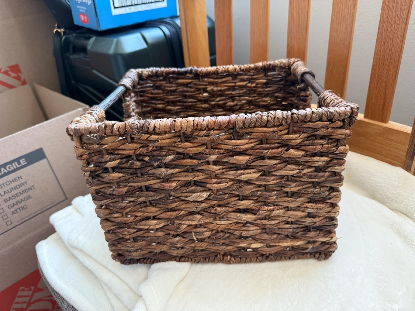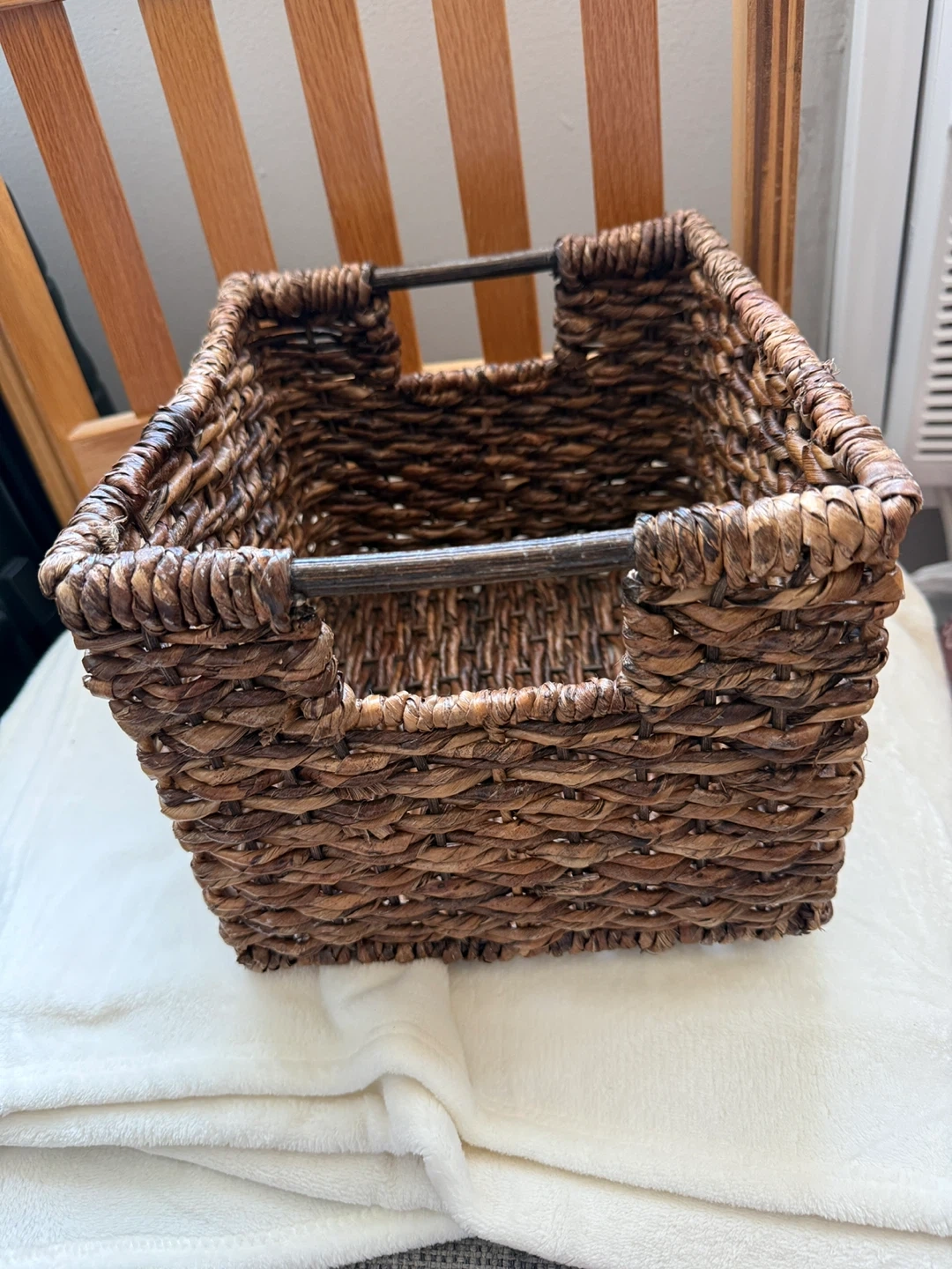 Selling a woven storage basket. It's in good condition and perfect for organizing items around the house. The basket has a rustic, natural look and features handles for easy carrying. It's a great way to add some texture and warmth to your decor!