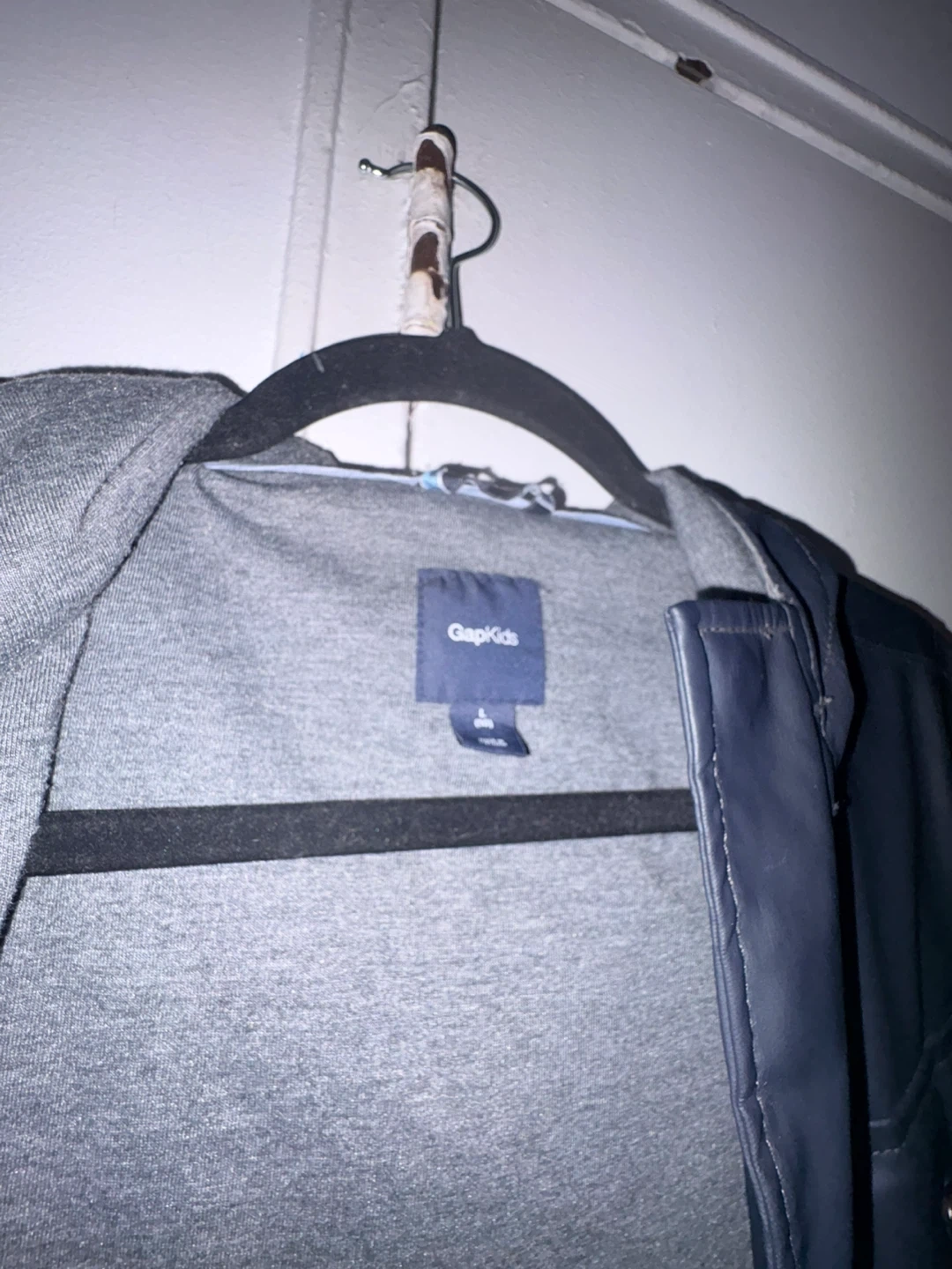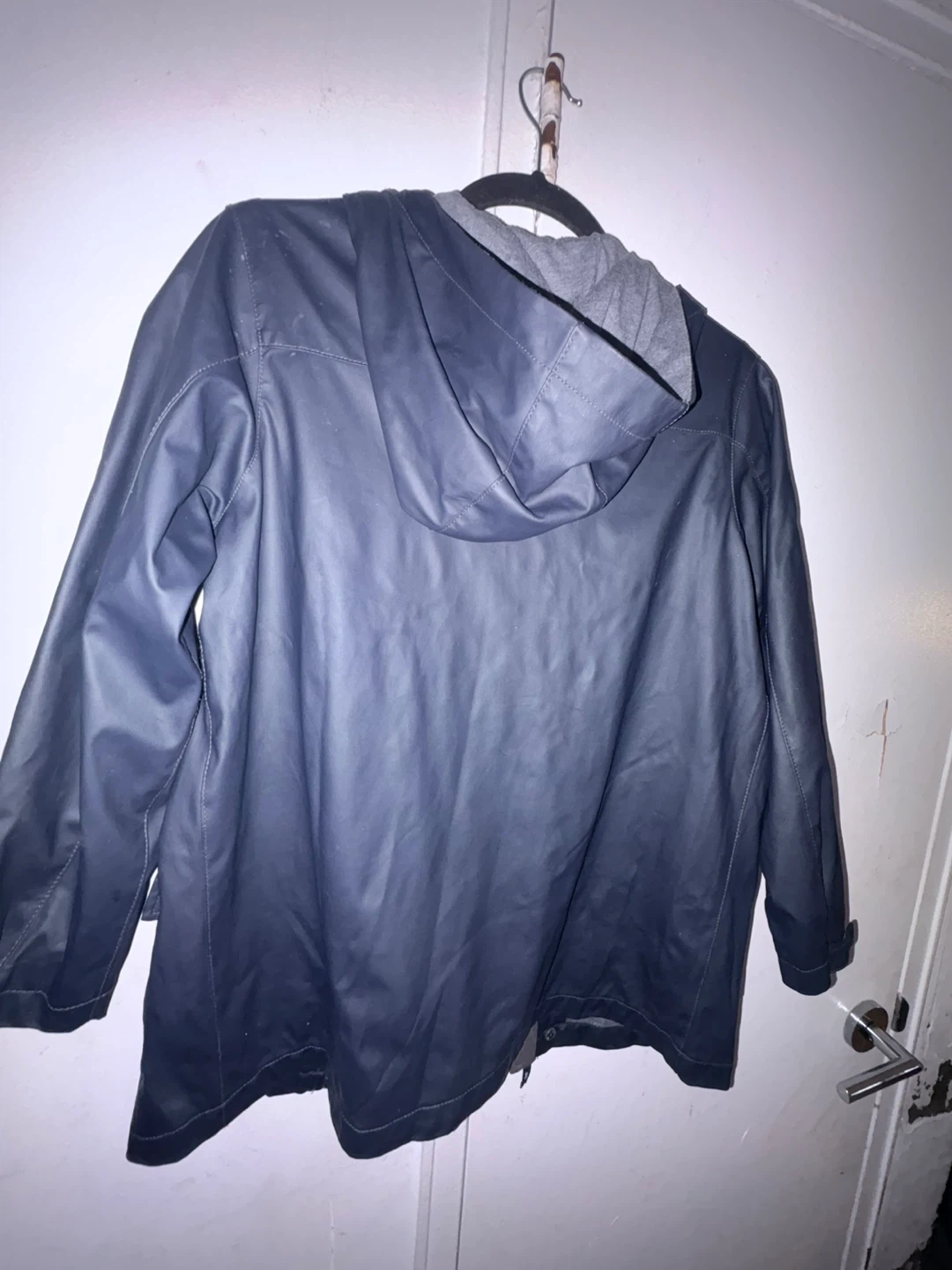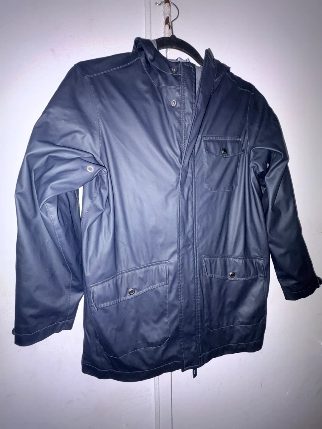 This navy blue raincoat from GapKids features a hood and two front pockets. It's made with a water-resistant material. Size is S.