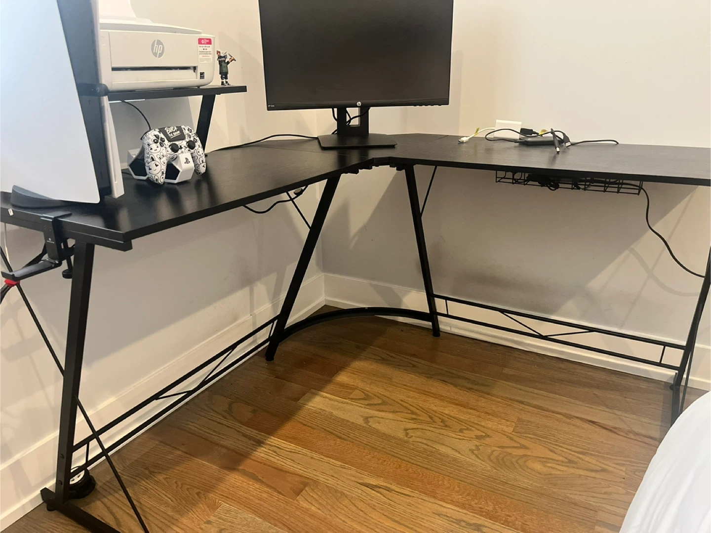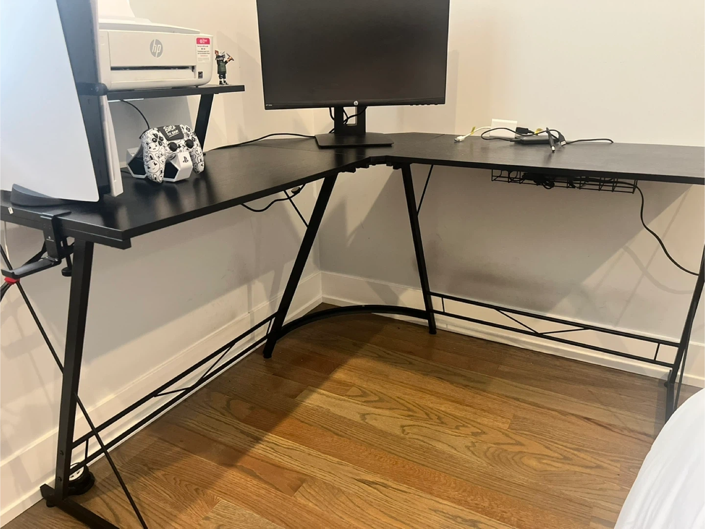 This black L-shaped desk offers ample workspace. It features a monitor shelf and a max load capacity of 150lbs+. Dimensions: 51" x 51" x 29.5" overall height.
