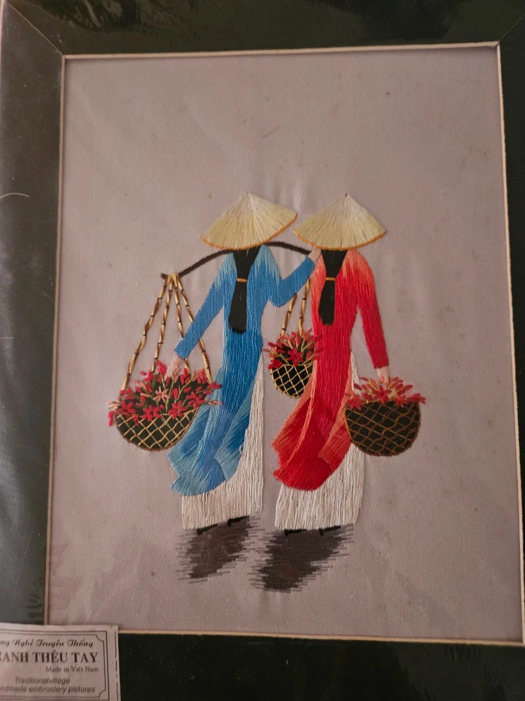 Handmade silk embroidery picture featuring two women in traditional Vietnamese conical hats carrying baskets of flowers. The artwork is framed and ready to hang. Made in Vietnam. Dimensions are approximately 12 x 14 inches.