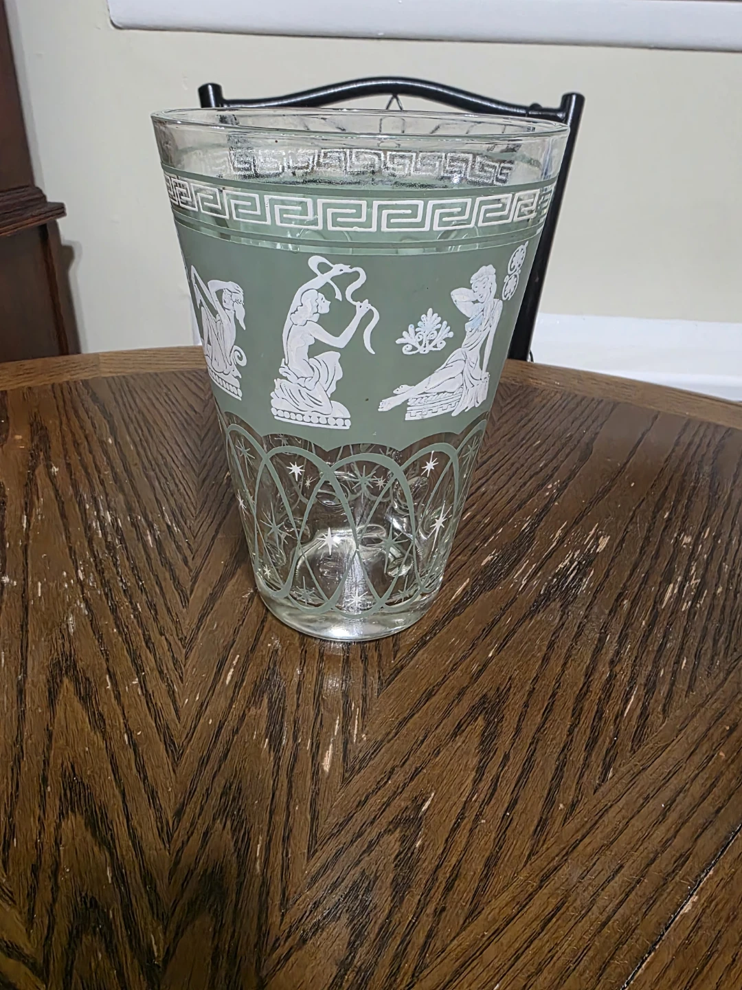 This green glass vase features a repeating Greek key pattern at the rim. White etched figures adorn the body, with a detailed starburst design at the base. It's a beautiful piece for floral arrangements or as a decorative accent!