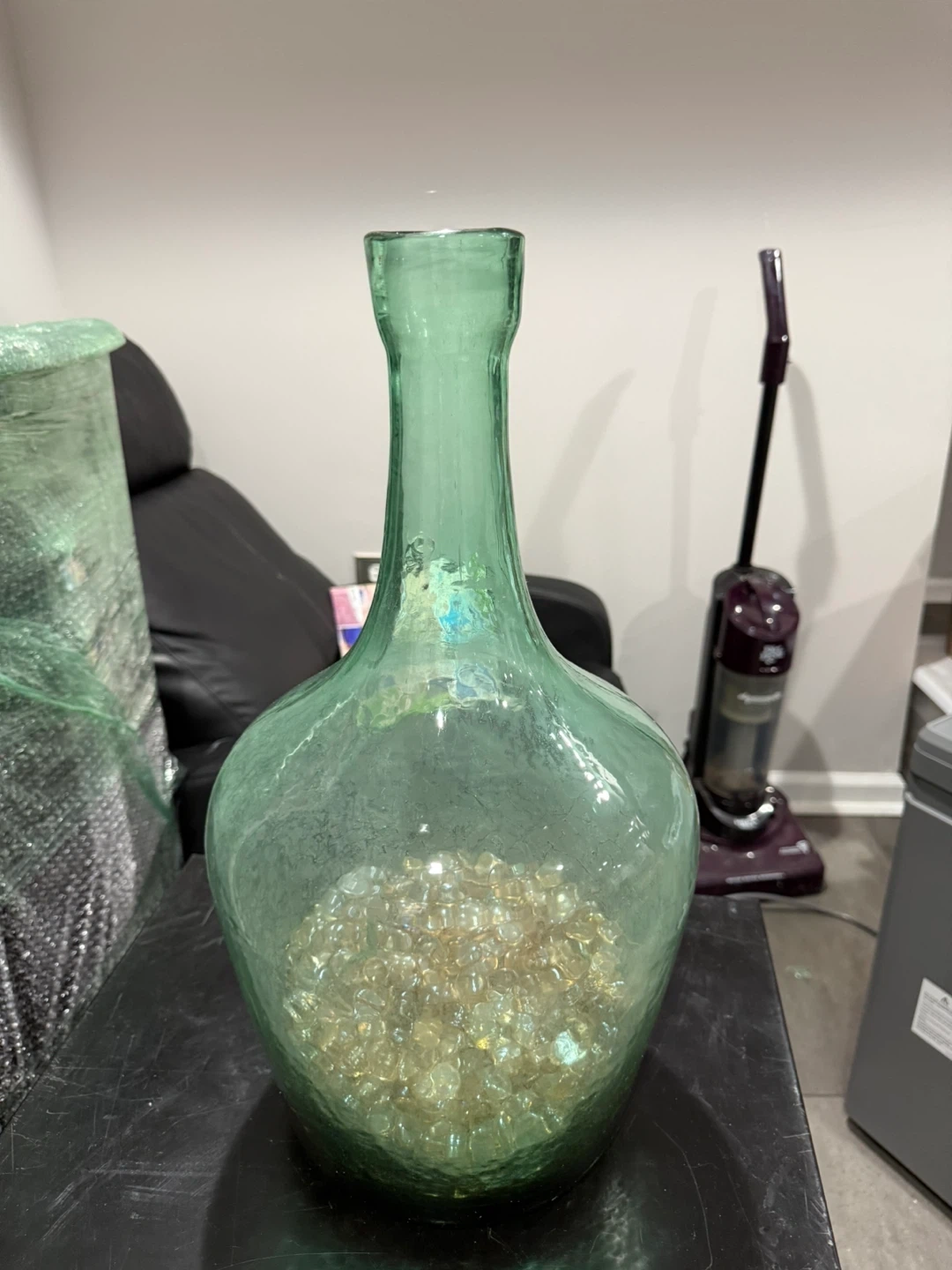 Here's a beautiful decorative green glass vase filled with clear beads! It's in great condition and ready to add a touch of elegance to your home decor