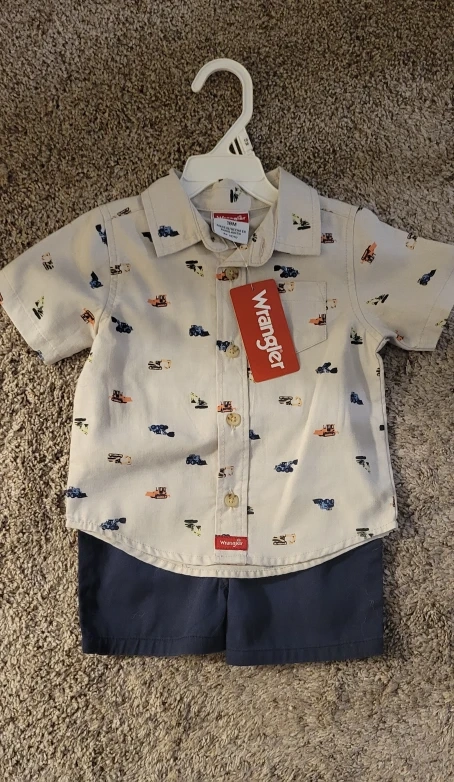 0Cute Wrangler baby boy outfit, size 18 months! The set includes a button-down shirt with a fun tractor print and navy blue shorts. Perfect for your little one to look stylish and stay comfortable.