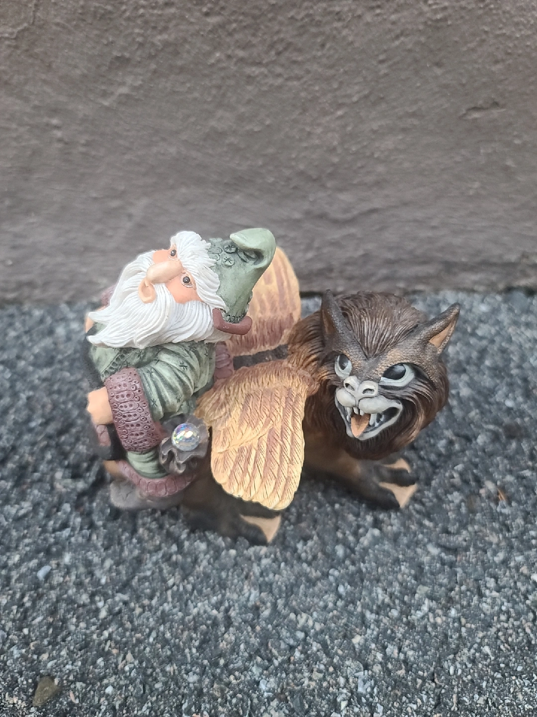 I'm selling a Wrendale Designs figurine. It features a gnome riding a winged creature. Made in England