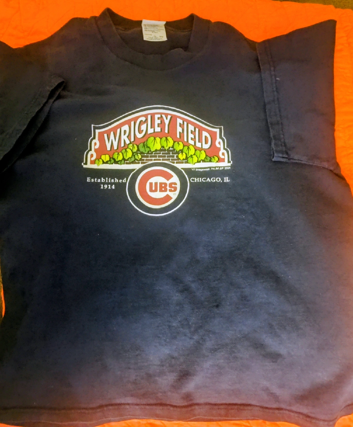 Selling a Wrigley Field Chicago Cubs t-shirt. It features the classic Wrigley Field logo with the Cubs emblem. Great for any Cubs fan!