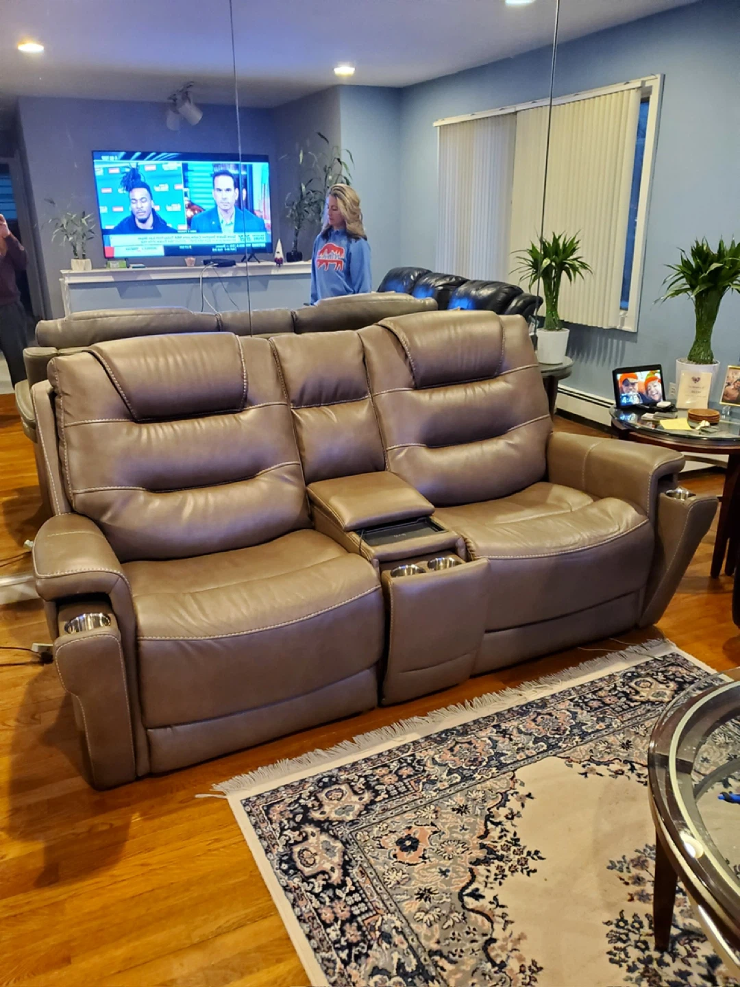 2 recliners (electric power), 4 cup holders, middle council, 2 USB ports/2 plugs in middle and 1 on each side of chairs.