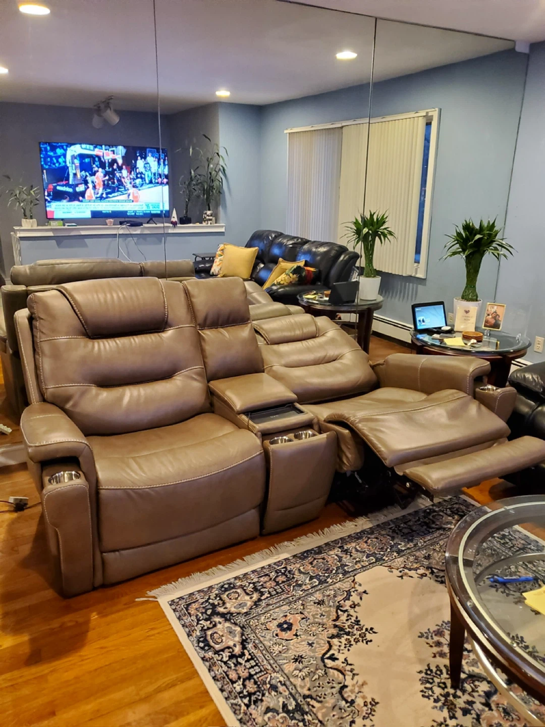 Selling a comfy brown leather reclining loveseat! It features a center console with cupholders, perfect for movie nights or just relaxing. The recliner function works great. It's a great addition to any living room or entertainment space