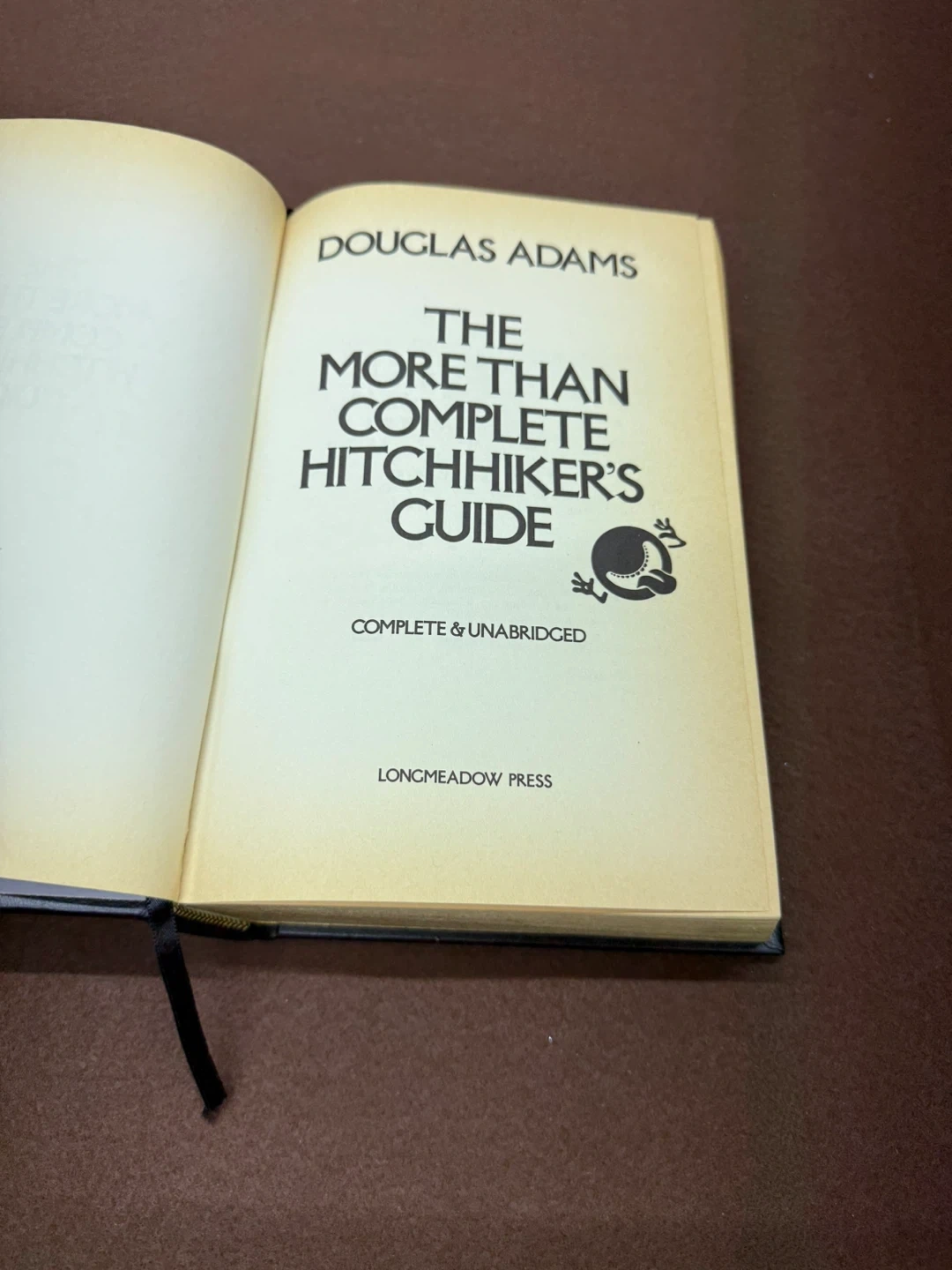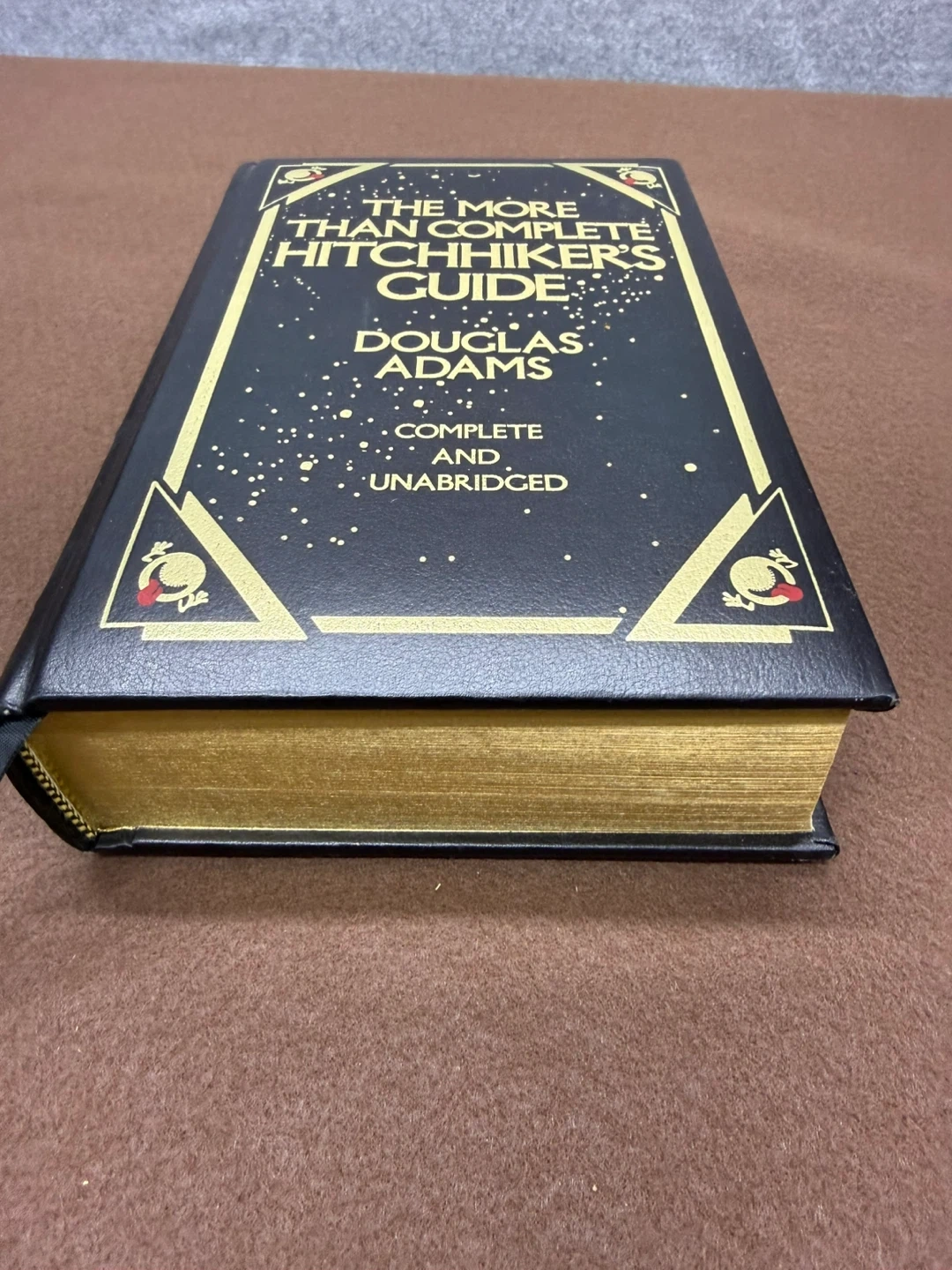 This is a complete and unabridged edition of The More Than Complete Hitchhiker's Guide by Douglas Adams. It's bound in genuine bonded leather with gold-gilded pages. The book includes a ribbon bookmark and features decorative endpapers.