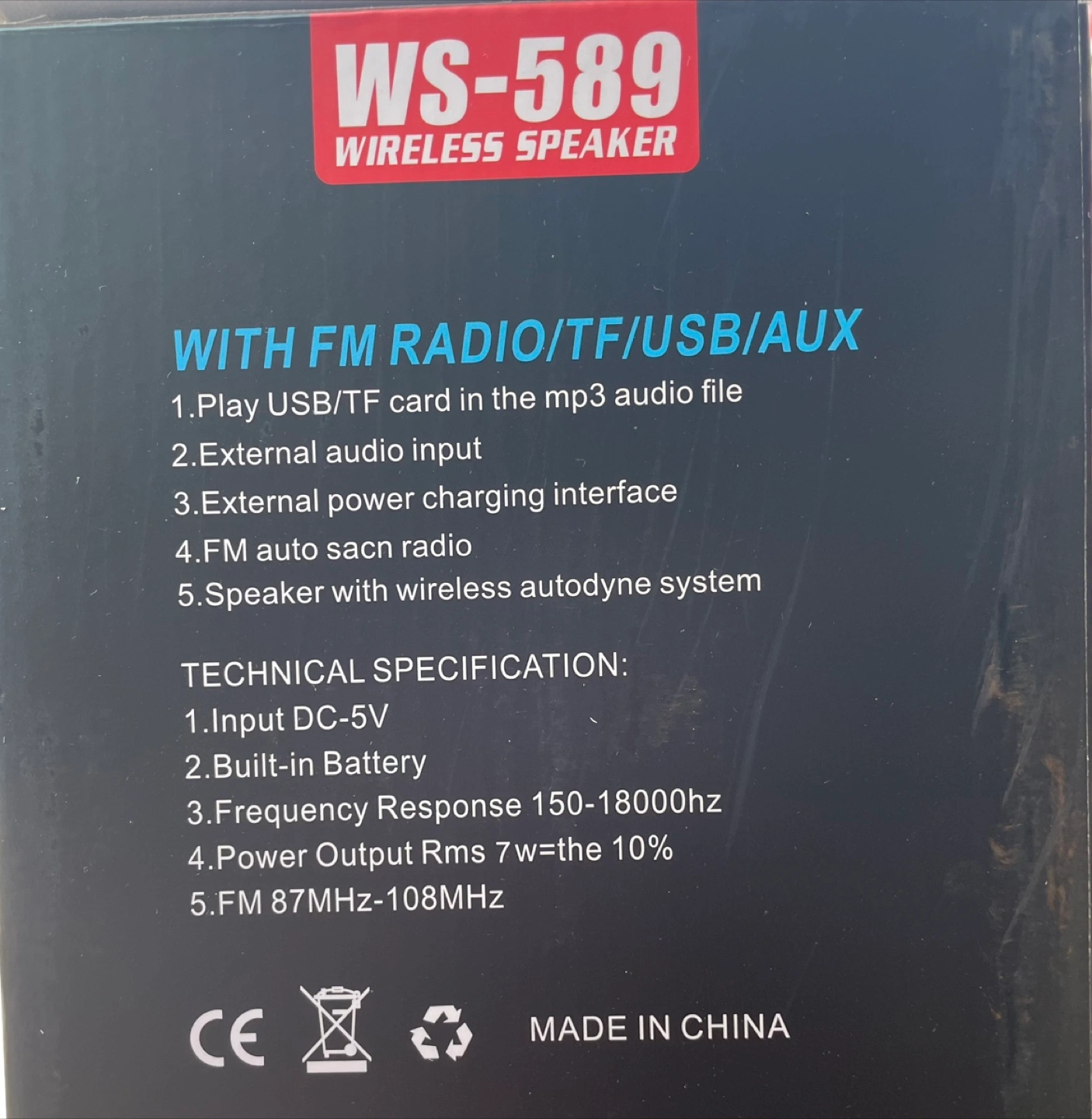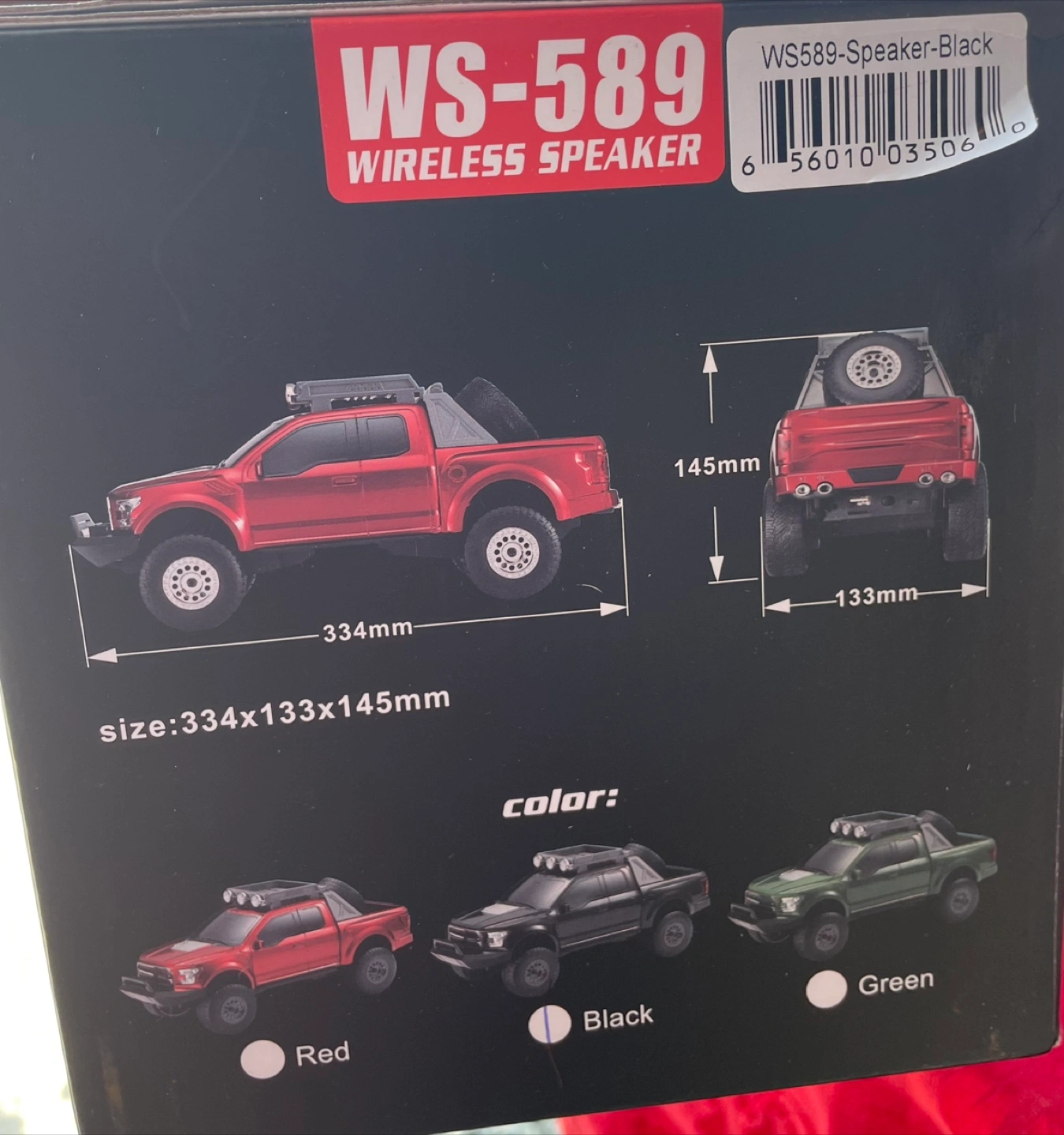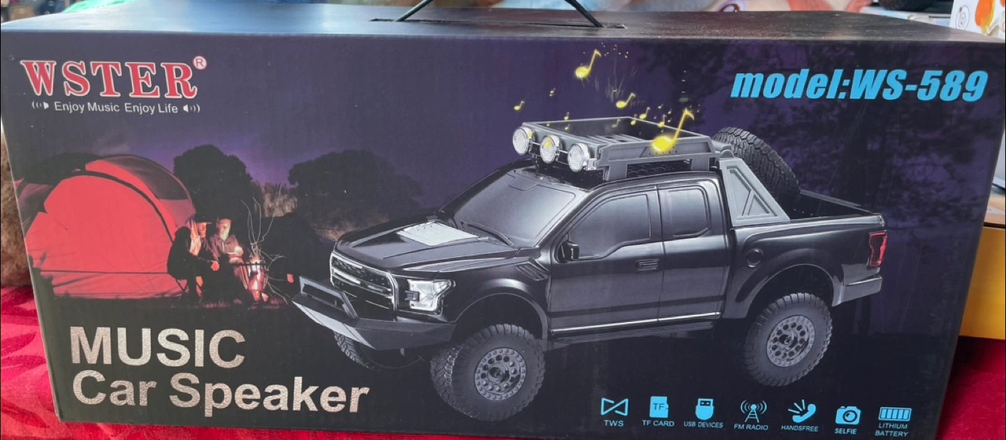 Selling a WSTER WS-589 Music Car Speaker! This wireless speaker is designed to look like a cool pickup truck. It has a built-in battery and can play music from USB, TF cards, FM radio, and AUX input. The dimensions are 334mm x 133mm x 145mm. The color is black. Enjoy music everywhere!