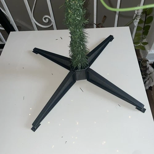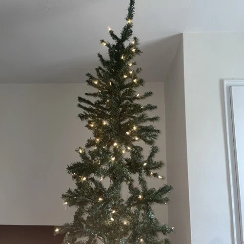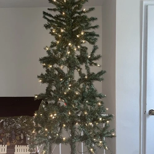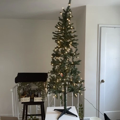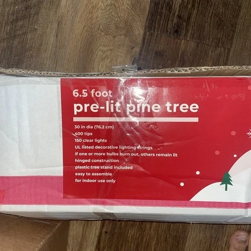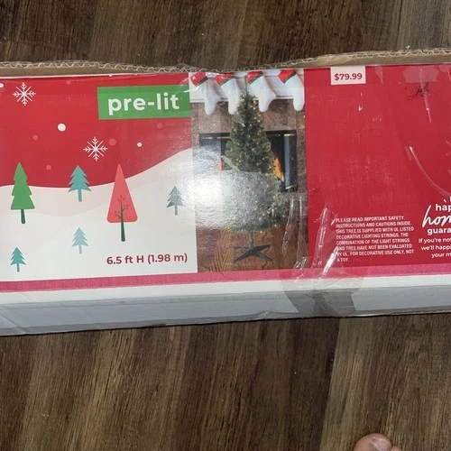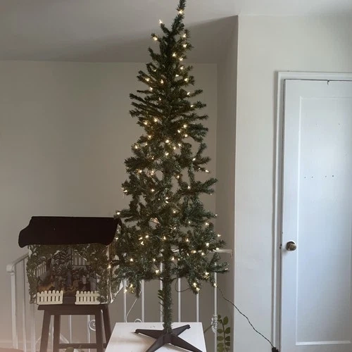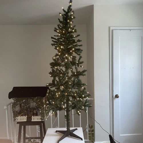 This pre-lit artificial Christmas tree is a festive and elegant addition to your holiday decor. It's a vibrant green color and made of durable plastic, so it's sure to last for years. Used one year with box.