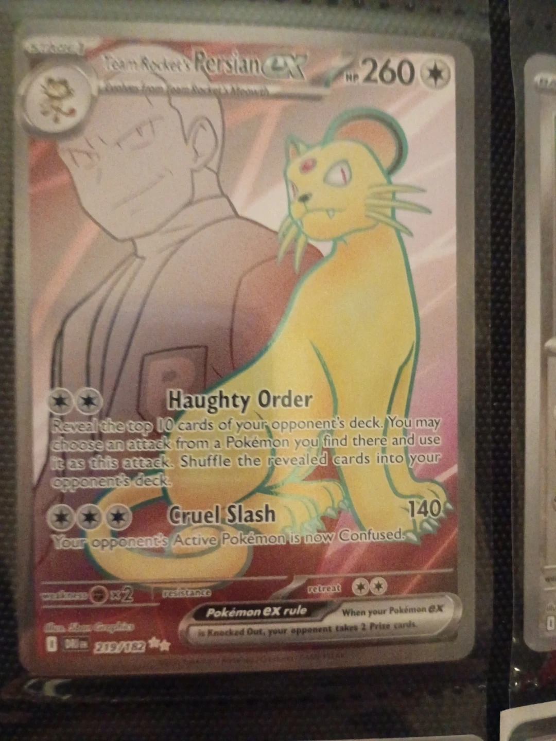 This is a Team Rocket's Persian EX Pokemon card. It has 260 HP and features the attacks Haughty Order and Cruel Slash. The card number is 219/182. miss print.