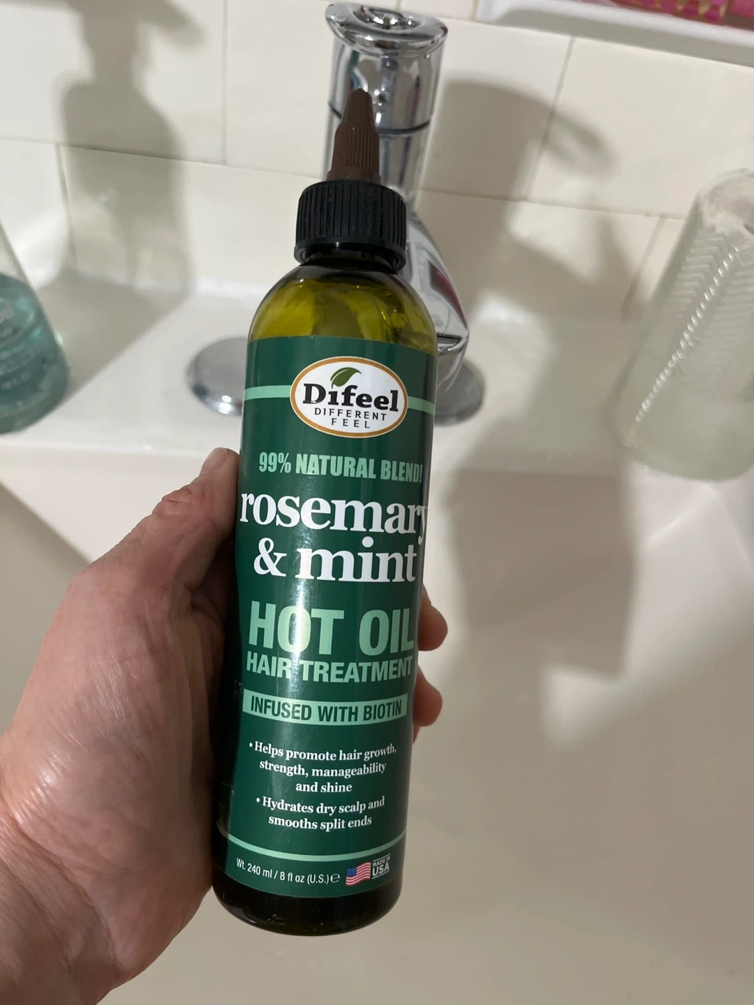 This is a 99% natural blend Difeel Rosemary & Mint Hot Oil Hair Treatment. It's infused with biotin to help promote hair growth, strength, manageability, and shine. It also hydrates dry scalp and smooths split ends.