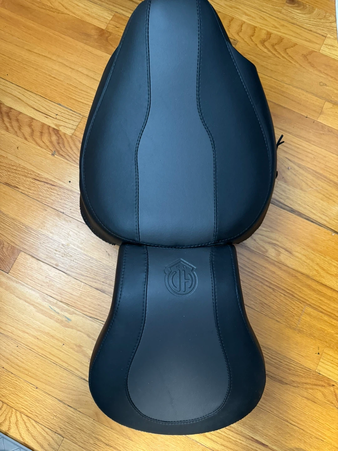 This is a two-piece motorcycle seat. It's black leather with stitched detailing. It features the Harley Davidson logo embossed on the rear seat.