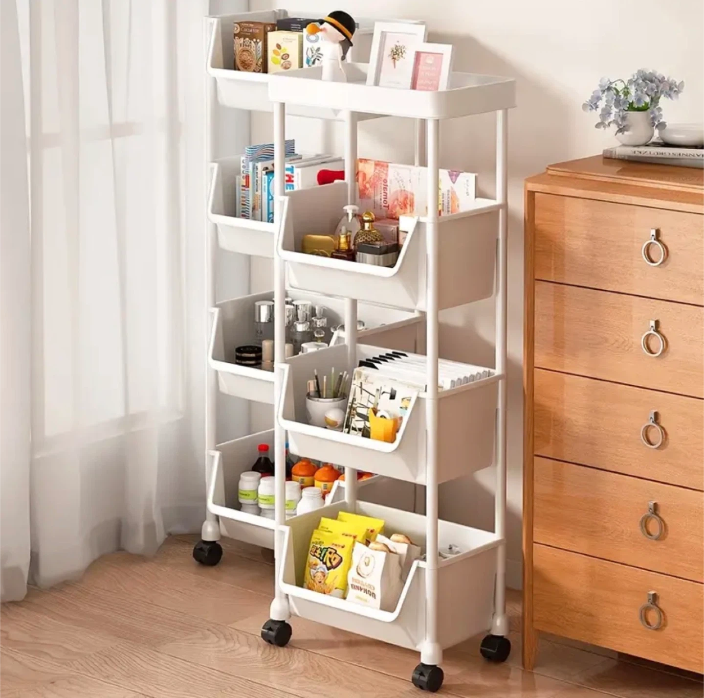 This rolling storage cart features five tiers with deep for ample storage. It's made of gray plastic and has wheels for easy mobility. Perfect for organizing items in kitchens, bathrooms, or craft rooms!