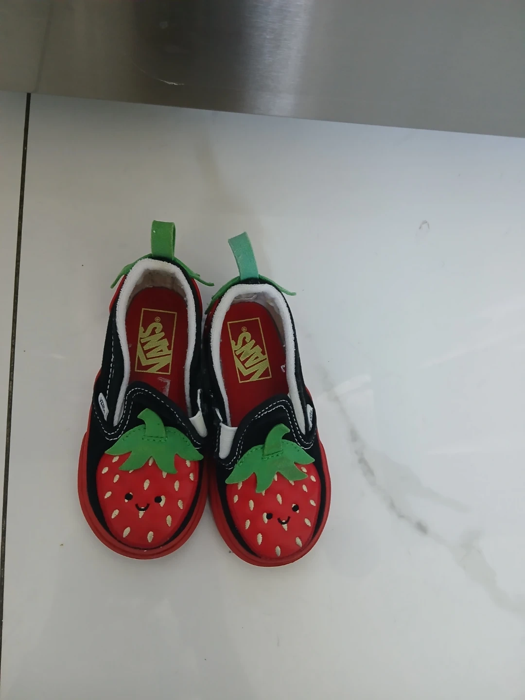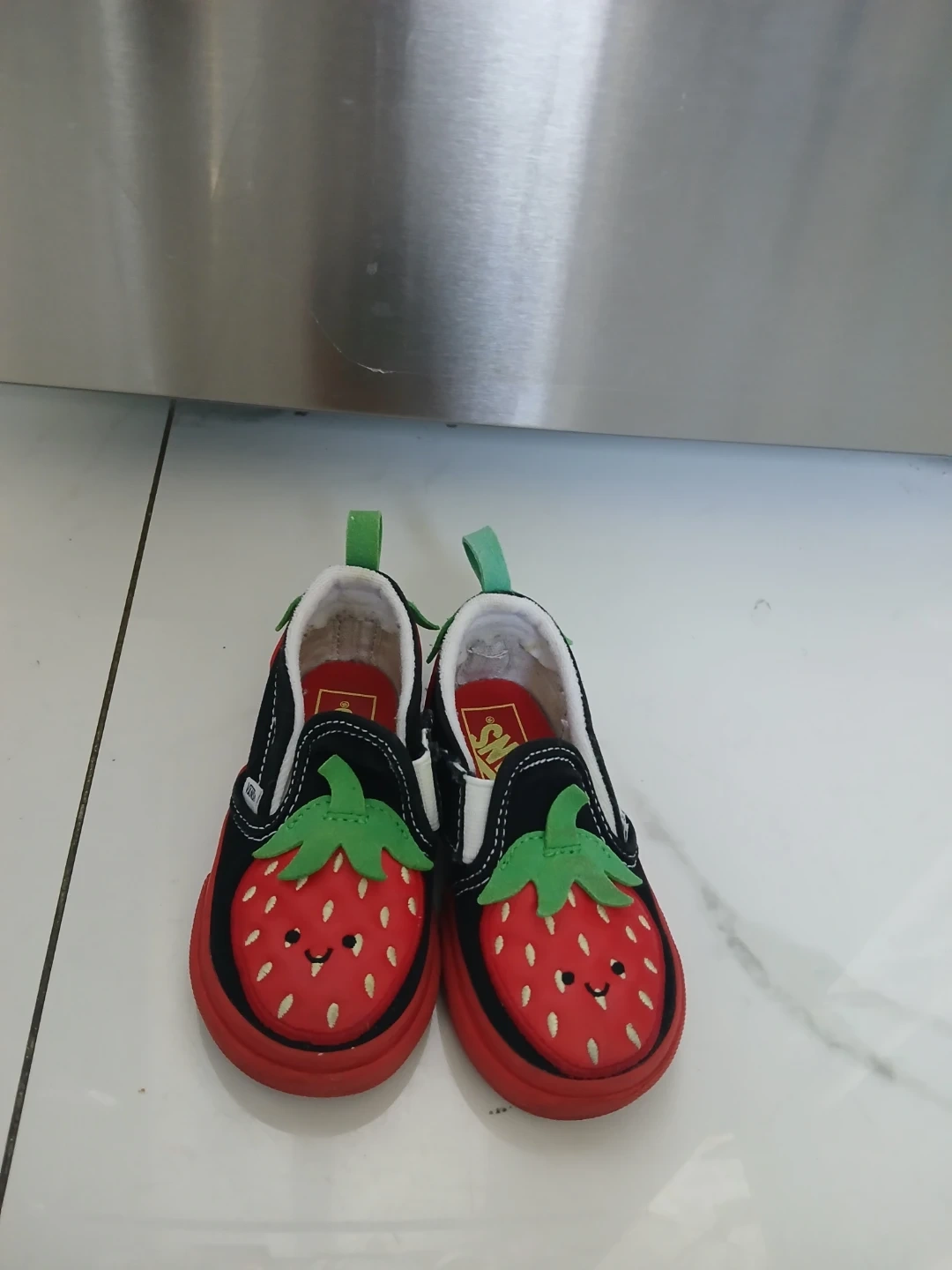Cute Vans toddler slip-on shoes with a fun strawberry design. Features a black canvas upper with red strawberry appliqués and green stem accents. Easy pull tabs on the heel. Perfect for little ones who love a playful look! Size 7