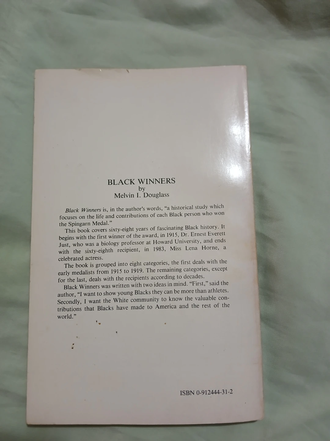 This book covers sixty-eight years of fascinating Black history. It begins with the first winner of the award, in 1915. The book is grouped into eight categories, the first deals with the early medalists from 1915 to 1919. It details the recipients according to decades. A little bit of water damage on the front but not inside