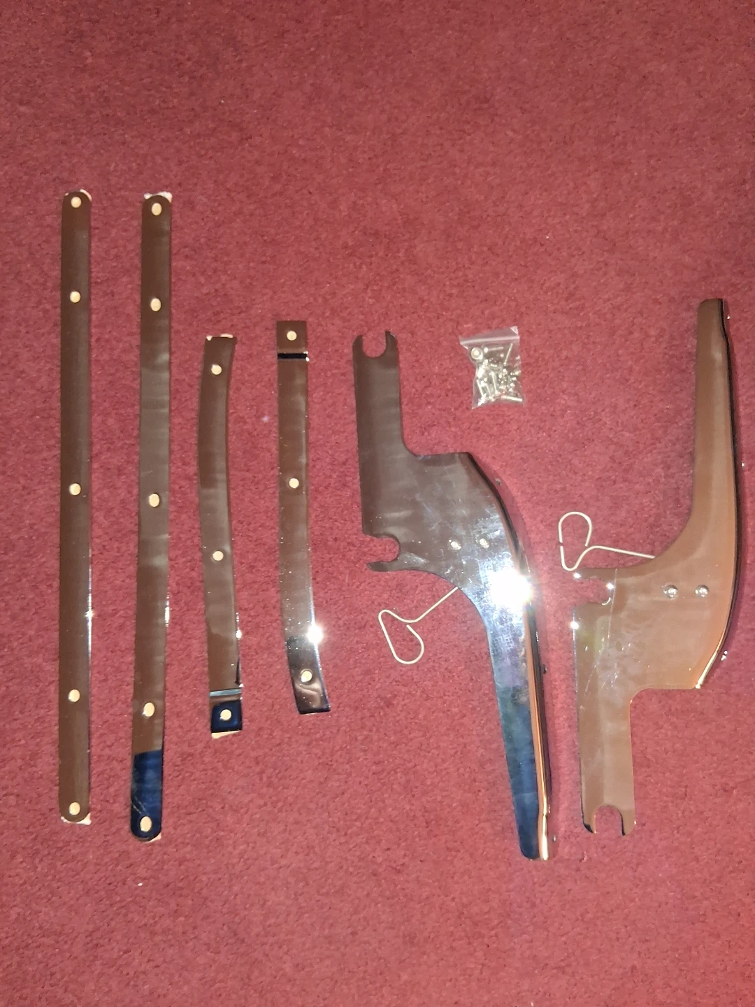 This is a clear motorcycle windshield FLHR with a mounting hardware kit. It includes various chrome-finished brackets and a bag of screws. Shields riders from wind and debris.