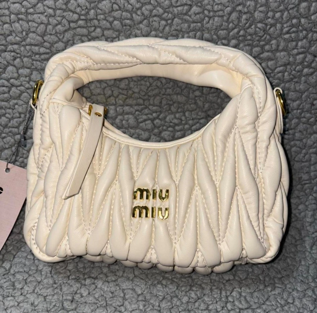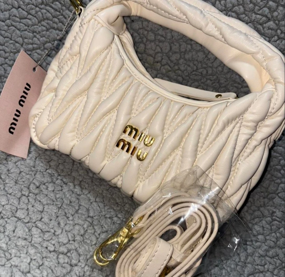 This creame shoulder bag features signature matelasse quilting and gold-tone hardware. It includes a detachable strap. Leather material.