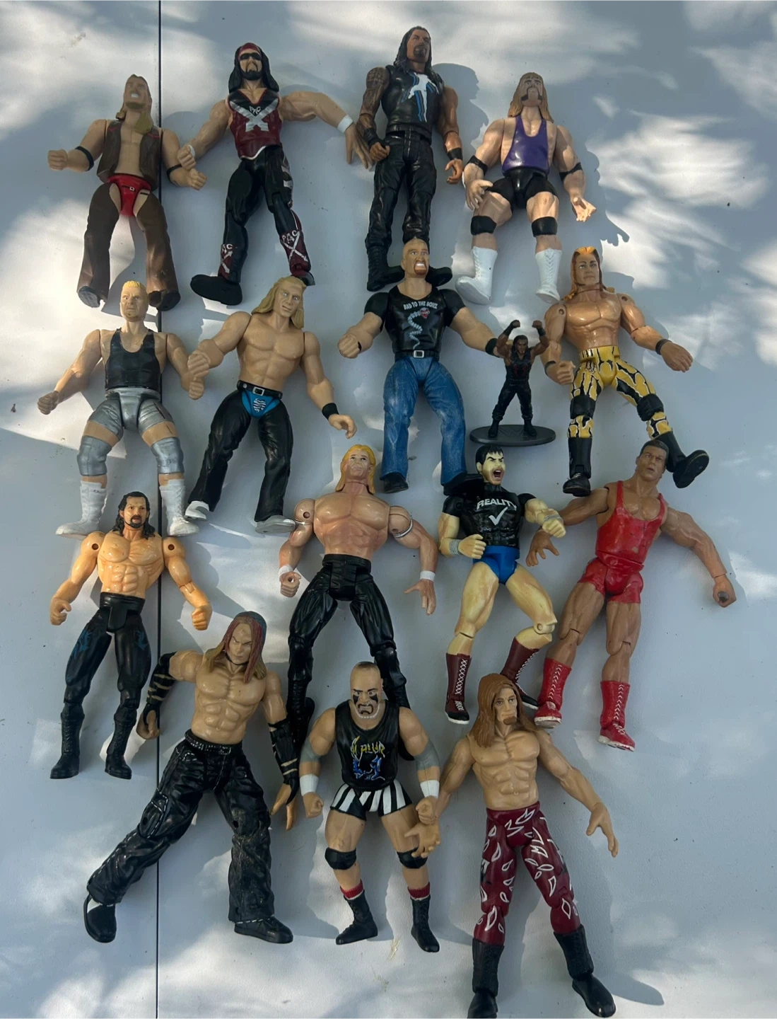 Selling a collection of WWE wrestling action figures. Includes various wrestlers in different outfits and poses. Great for collectors or kids who love wrestling!