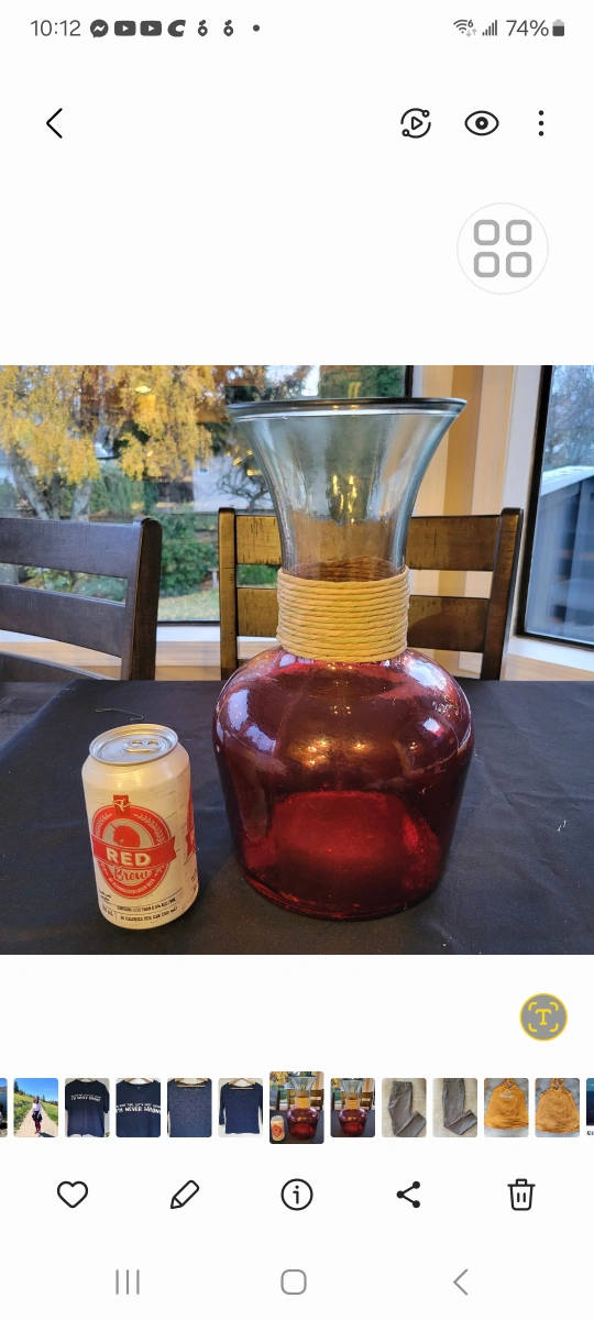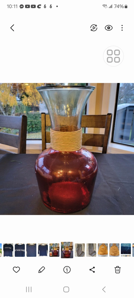 Selling a lovely red glass vase with a unique rope detail around the neck. It's in great condition and would make a beautiful addition to any room. Perfect for displaying your favourite flowers or as a standalone decorative piece.