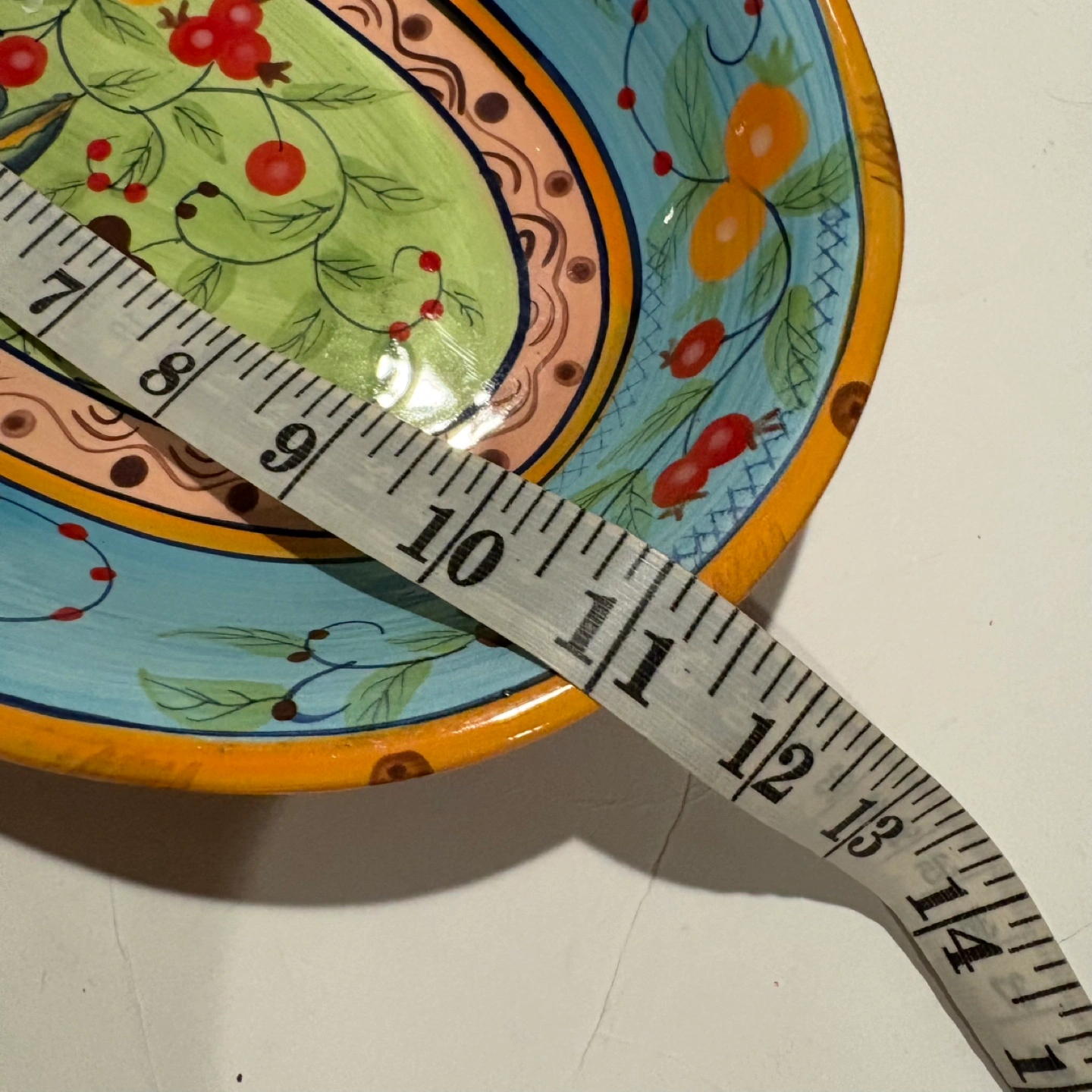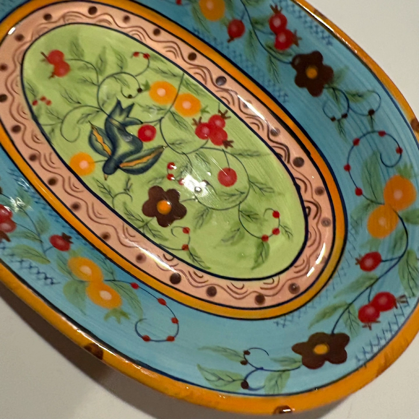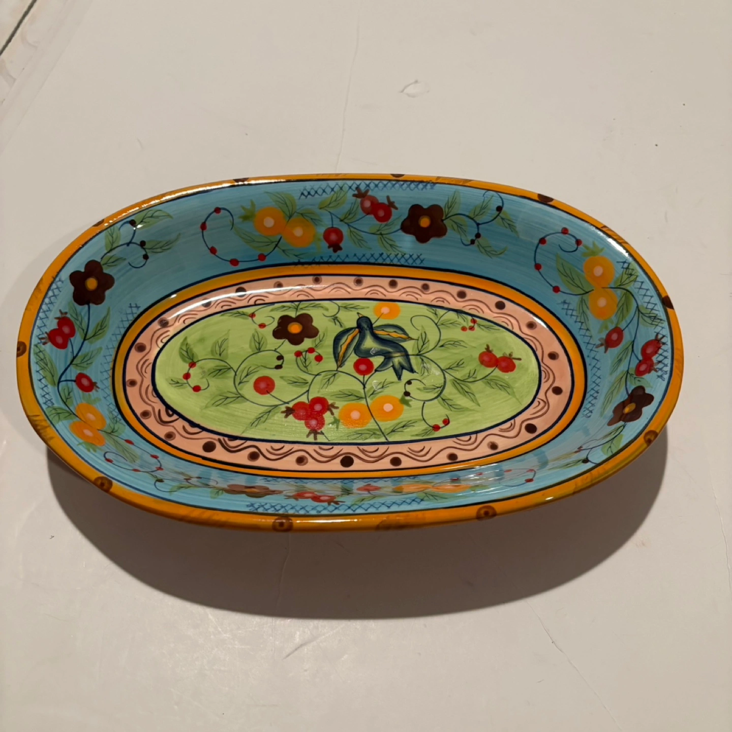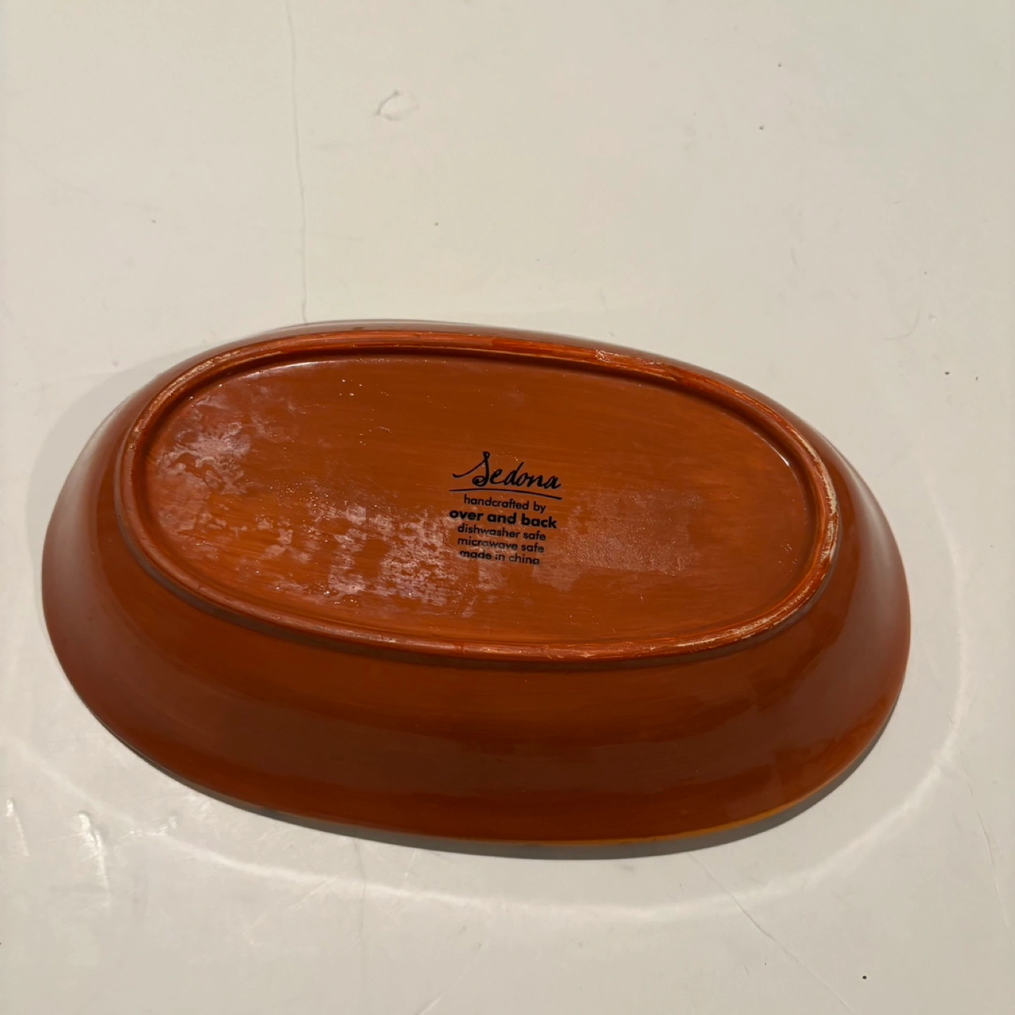 Oval serving dish, measures approximately 11 inches long and 3 inches wide. Handcrafted by Over and Back. Dishwasher and microwave safe.