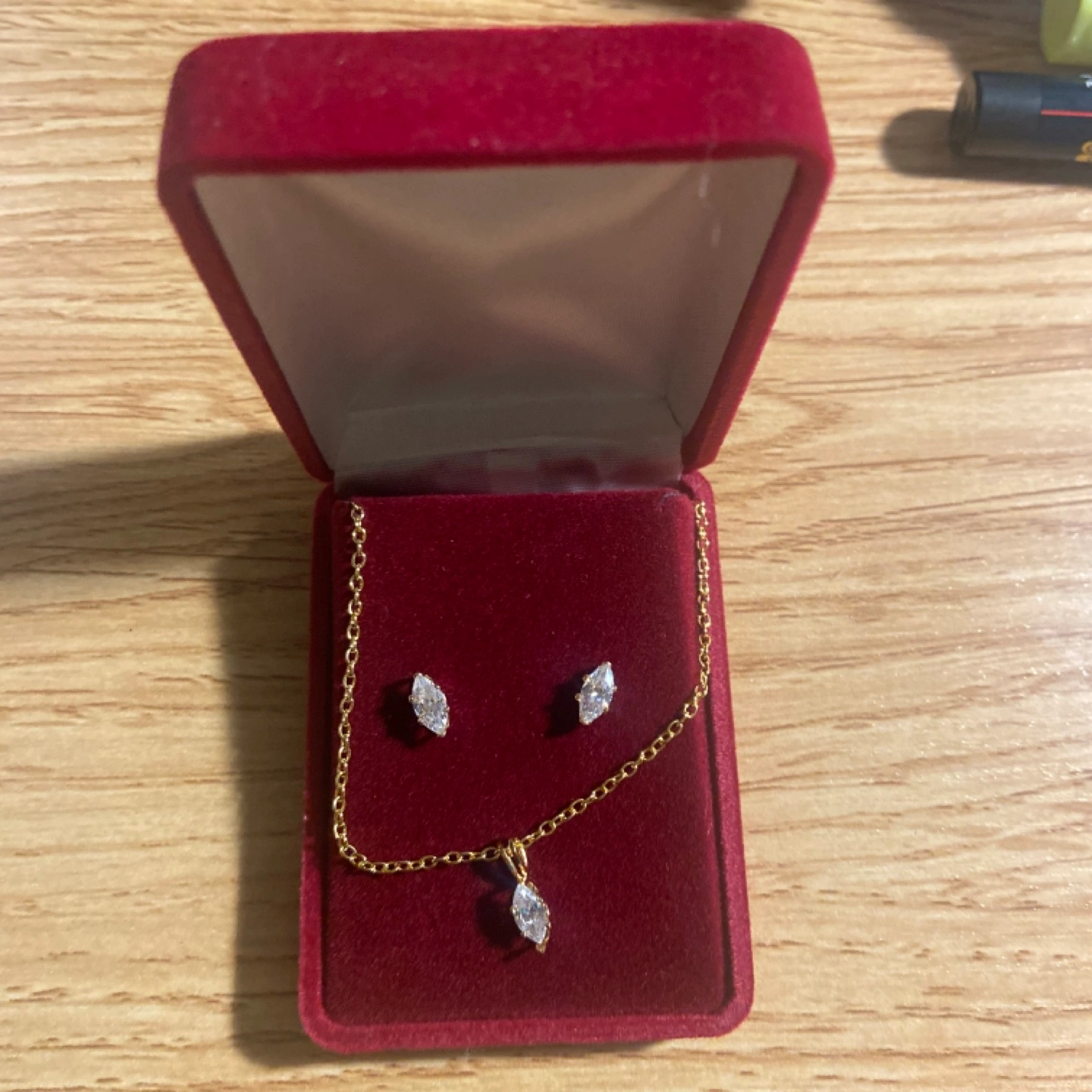 Stunning necklace and earrings set. Features marquise-cut cubic zirconia stones. Gold-tone chain and posts. Comes in a red velvet gift box.
