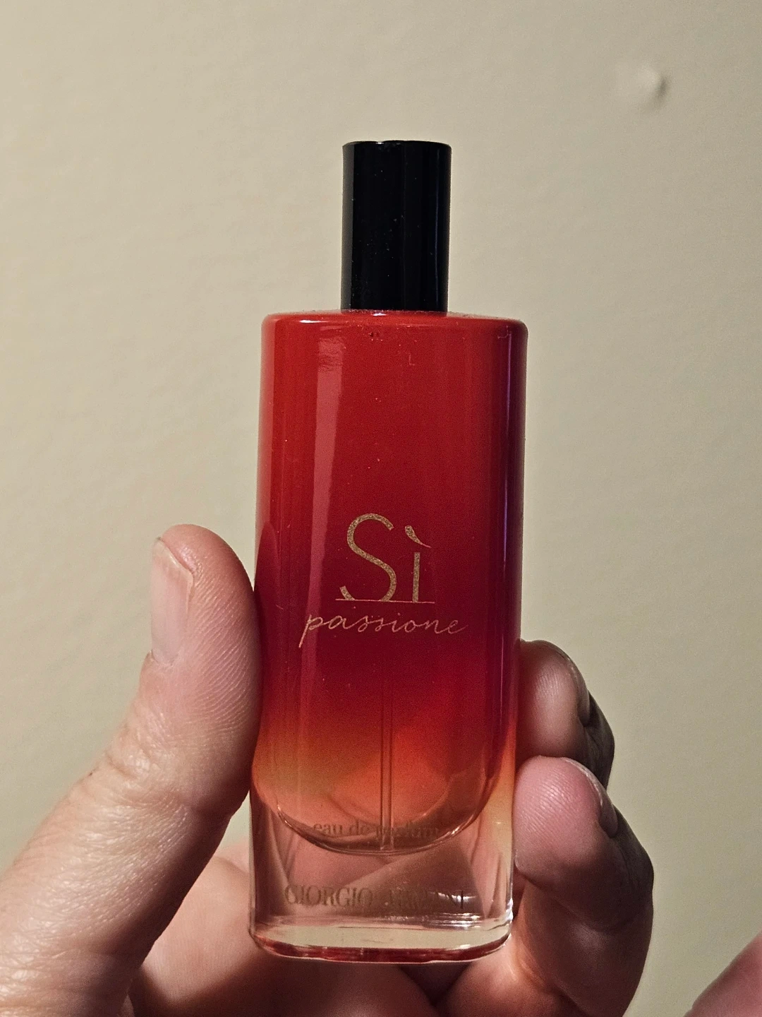 Giorgio Armani Si Passione Eau de Parfum bottle. Features a red to gradient glass bottle with a black cap. It's a vibrant and sensual scent. 0.5oz/15ml