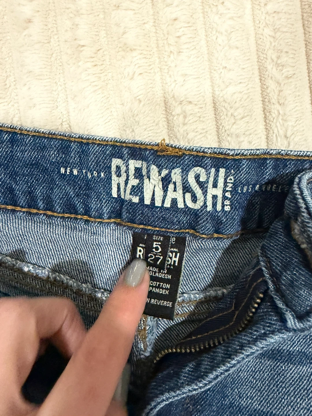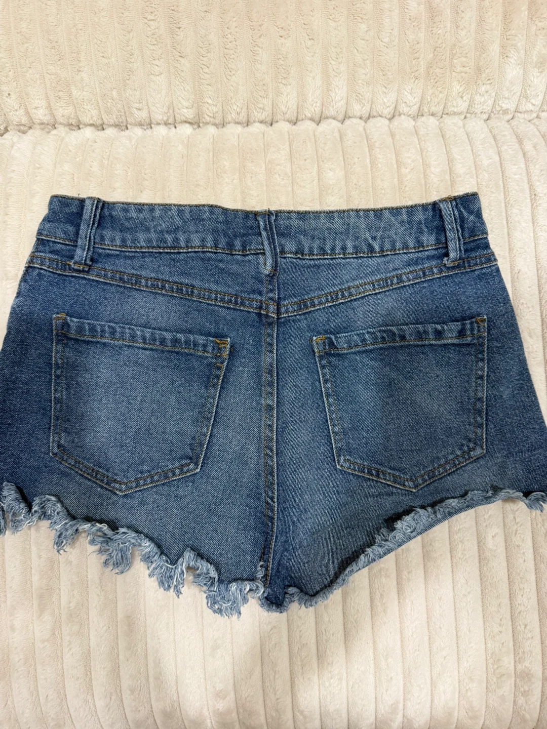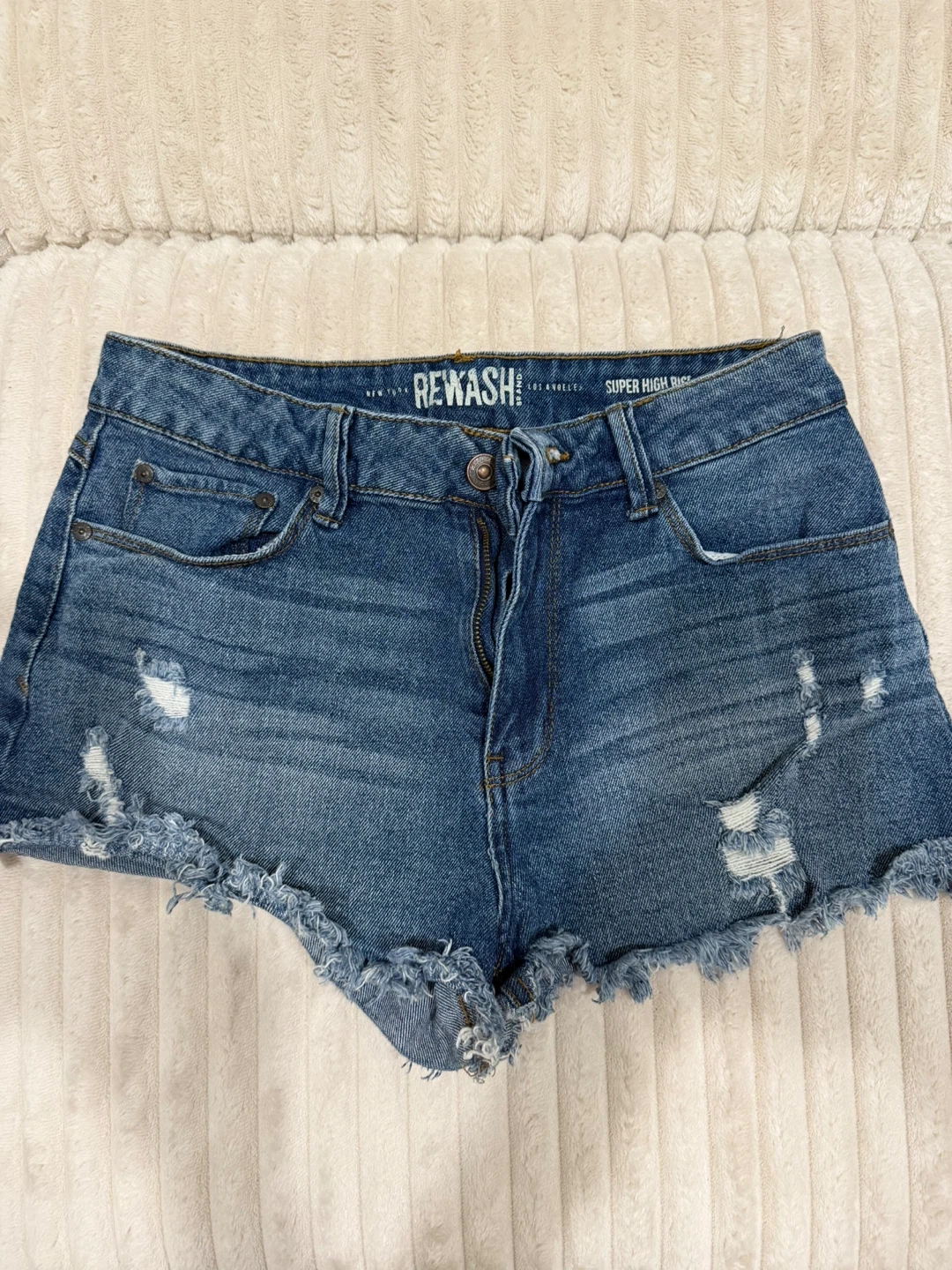 These Rewash denim shorts are a super high rise style. They feature a distressed look with frayed hems. Made from a cotton/Spandex blend.