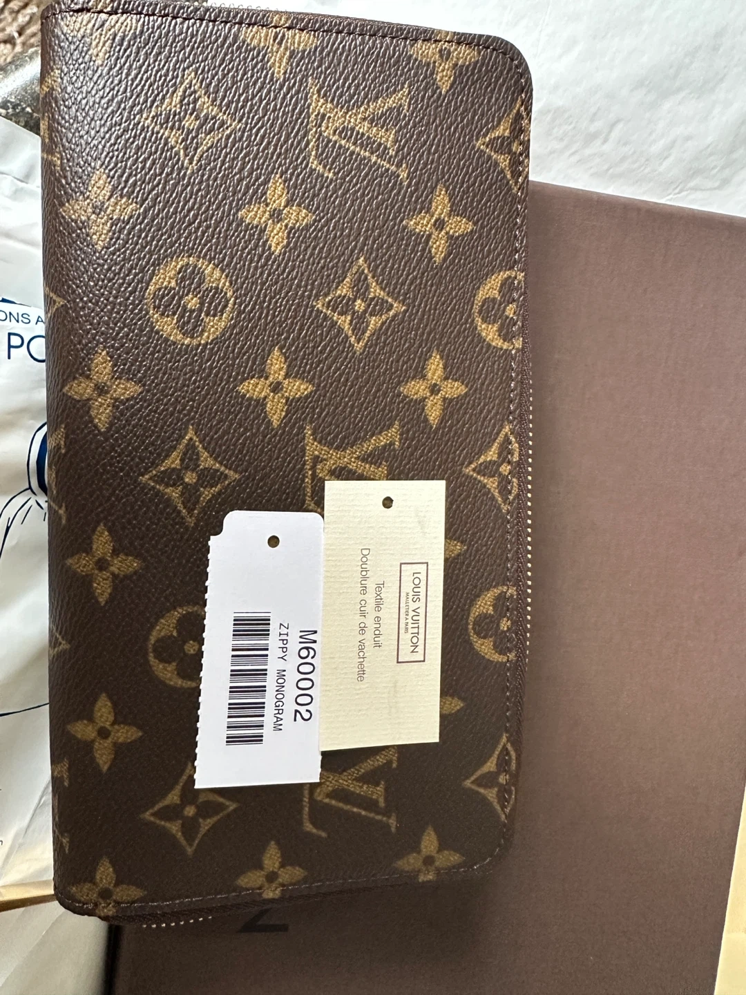 This is a Louis Vuitton Zippy wallet in the classic Monogram canvas. It's made in France and features a zip-around closure. The interior has multiple card slots and compartments. Monogram M60002