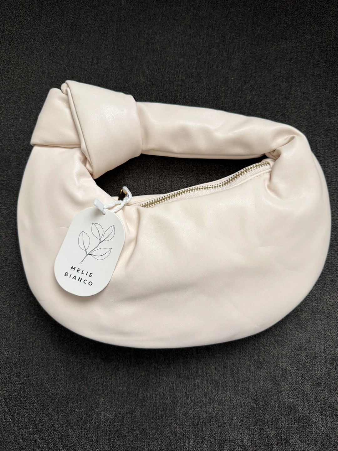 This is a Melie Bianco cream ruched crescent shoulder bag. It's made of vegan leather with a gold-tone zipper. This bag is perfect for everyday use!