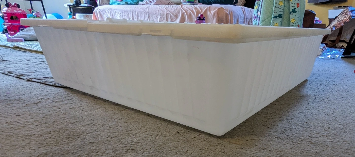 I'm selling a Ikea white plastic storage container that comes with its lid. It's in good condition and ready to help you organize your space. Perfect for storing items in your closet, garage, or anywhere you need extra storage!