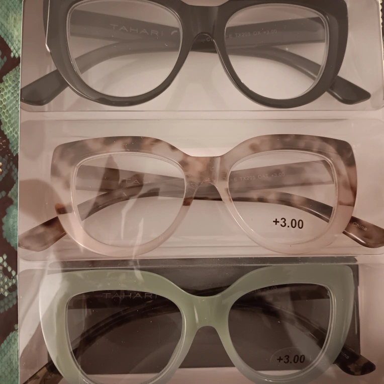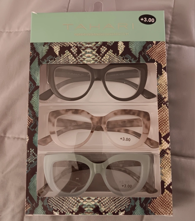 Three pairs of reading glasses, +3.00 diopter. Stylish and classic. Aspheric lenses. Durable construction. Scratch resistant. Distortion free. Hand polished. Comes in a box. 1 pr of 3 opened to try on only.