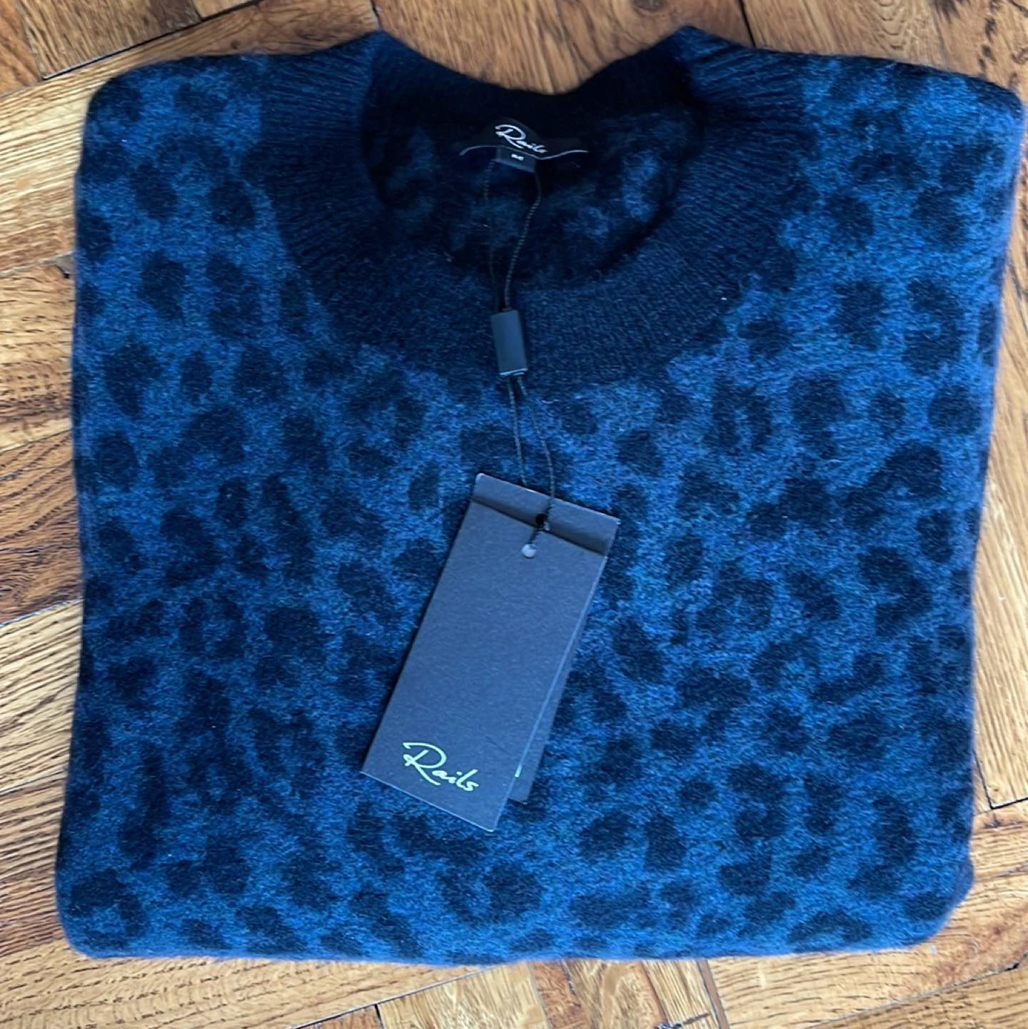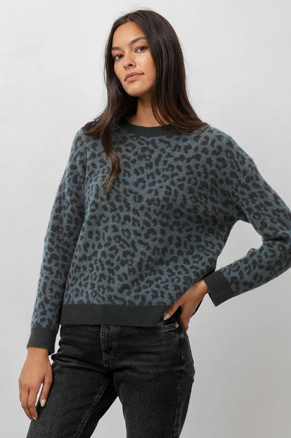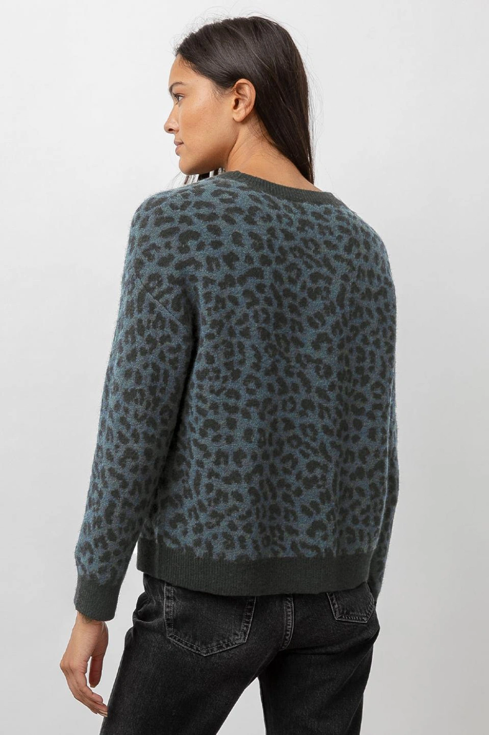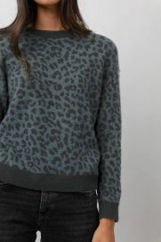 Medium weight wool blend, long sleeve, dark forest green crewneck sweater, featuring onyx black animal print jaguar design throughout. Relaxed, fit and contrasting black thick ribbed trim at neckline hem and cuffs.