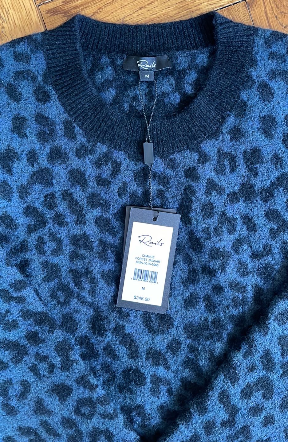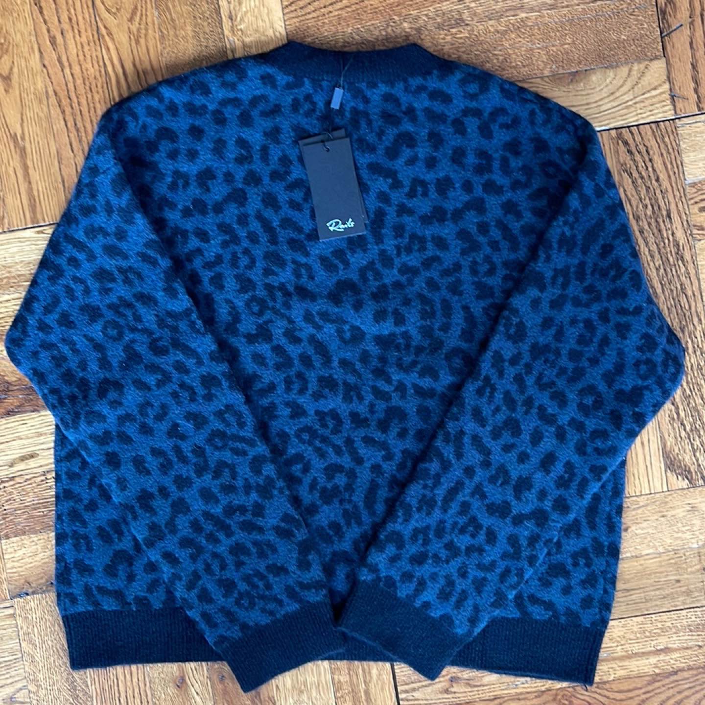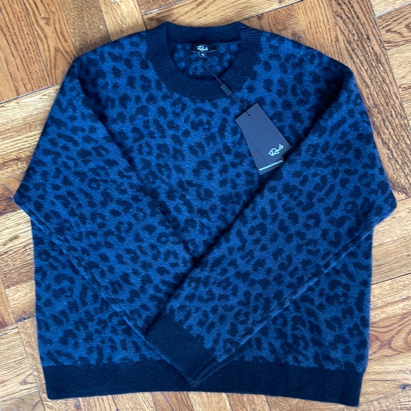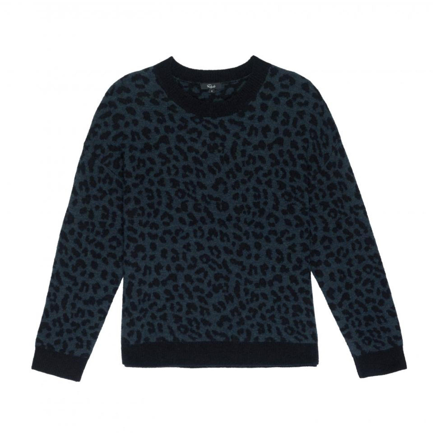 Medium weight wool blend, long sleeve, dark forest green crewneck sweater, featuring onyx black animal print jaguar design throughout. Relaxed, fit and contrasting black thick ribbed trim at neckline hem and cuffs.
