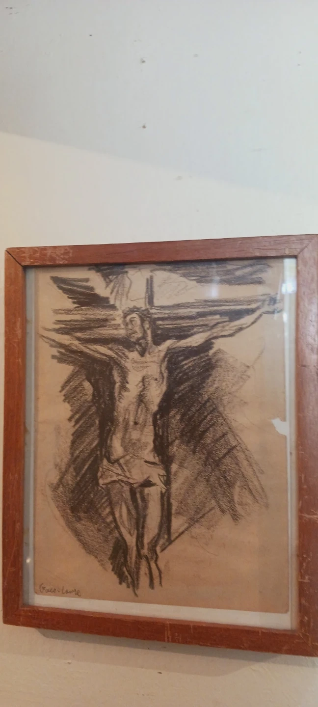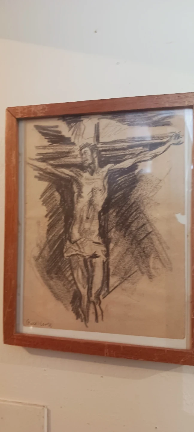 Framed Signed Vintage Charcoal Drawing Depicting Jesus Crucifixion. Features a charcoal drawing on paper, framed. This artwork would suit a personal collection or a religious setting. 11"×9". ALL MY PRICES ARE NEGOTIABLE !!