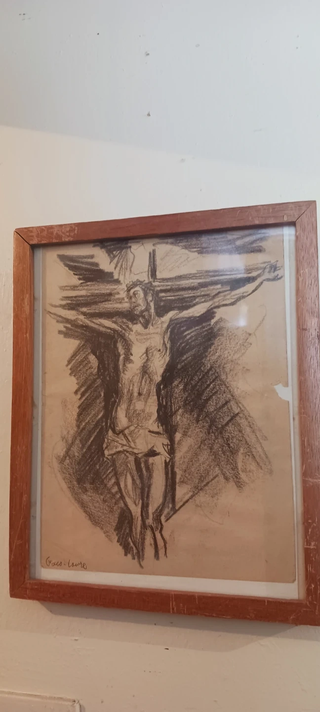 Framed Signed Vintage Charcoal Drawing Depicting Jesus Crucifixion. Features a charcoal drawing on paper, framed. This artwork would suit a personal collection or a religious setting. 11"×9". ALL MY PRICES ARE NEGOTIABLE !!