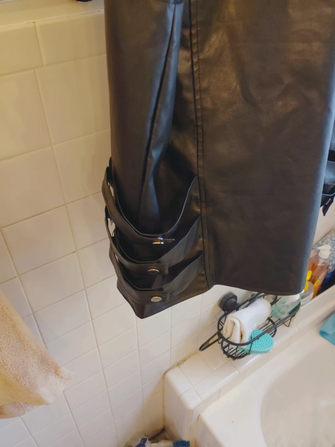 Black faux leather vest. Made of 50% PU and 50% Polyester. Features a zip-up front with two chest pockets and decorative strap details on the sides. Dry clean or hand clean only.