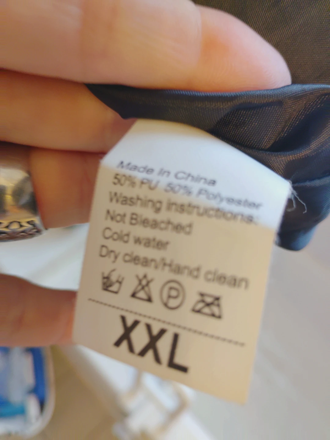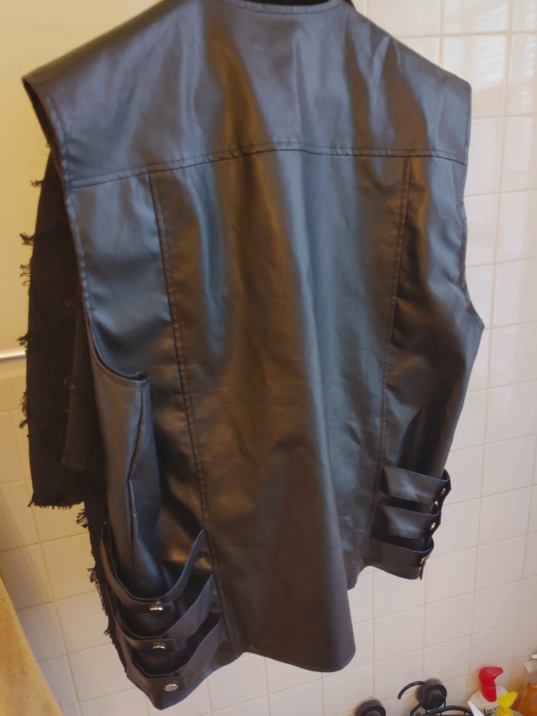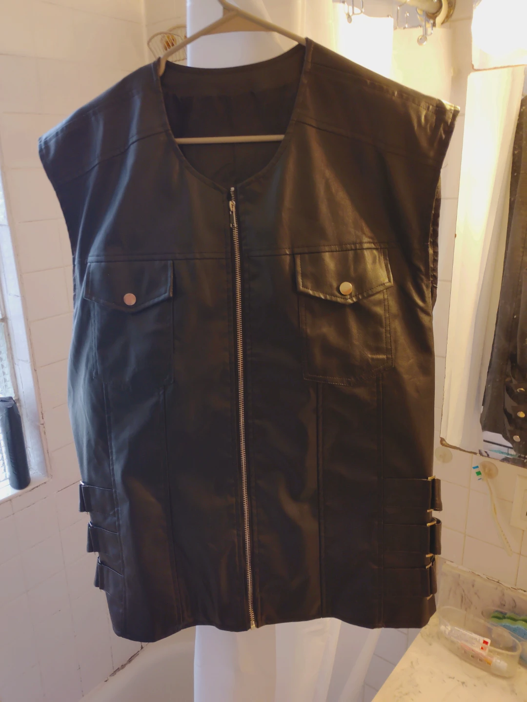 Black faux leather vest. Made of 50% PU and 50% Polyester. Features a zip-up front with two chest pockets and decorative strap details on the sides. Dry clean or hand clean only.
