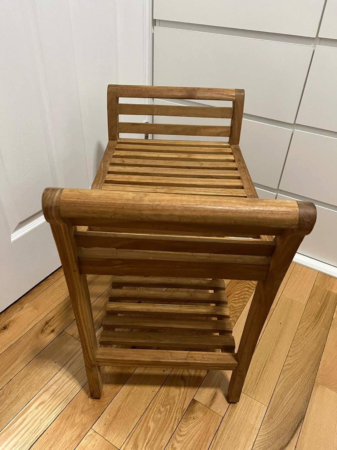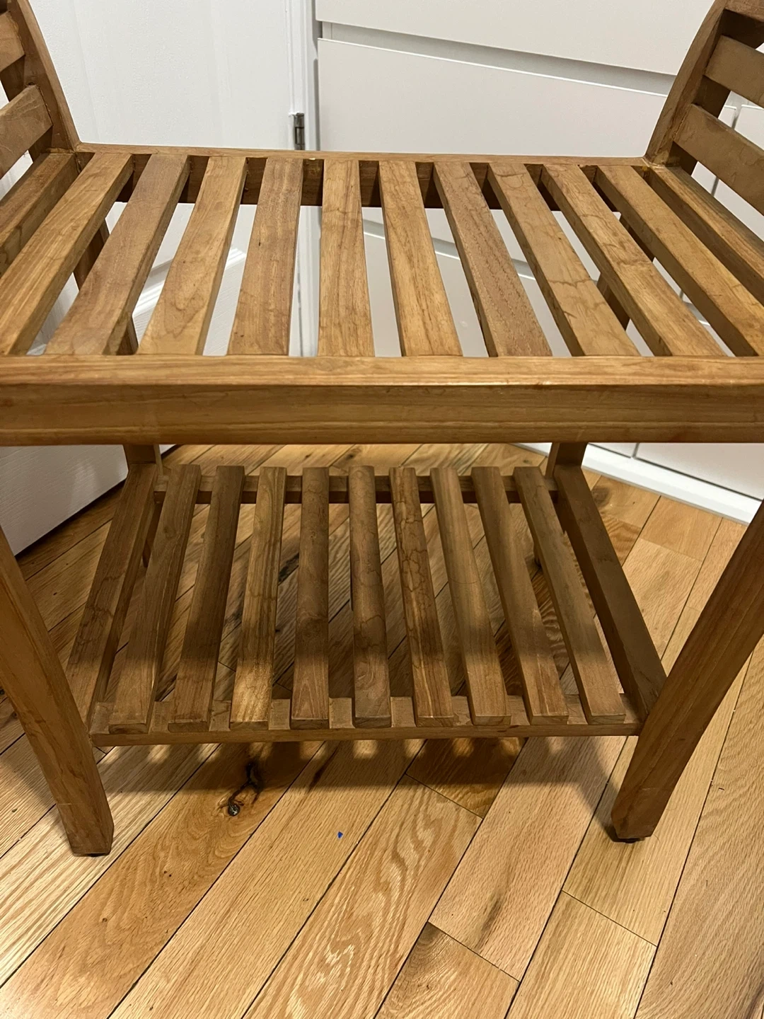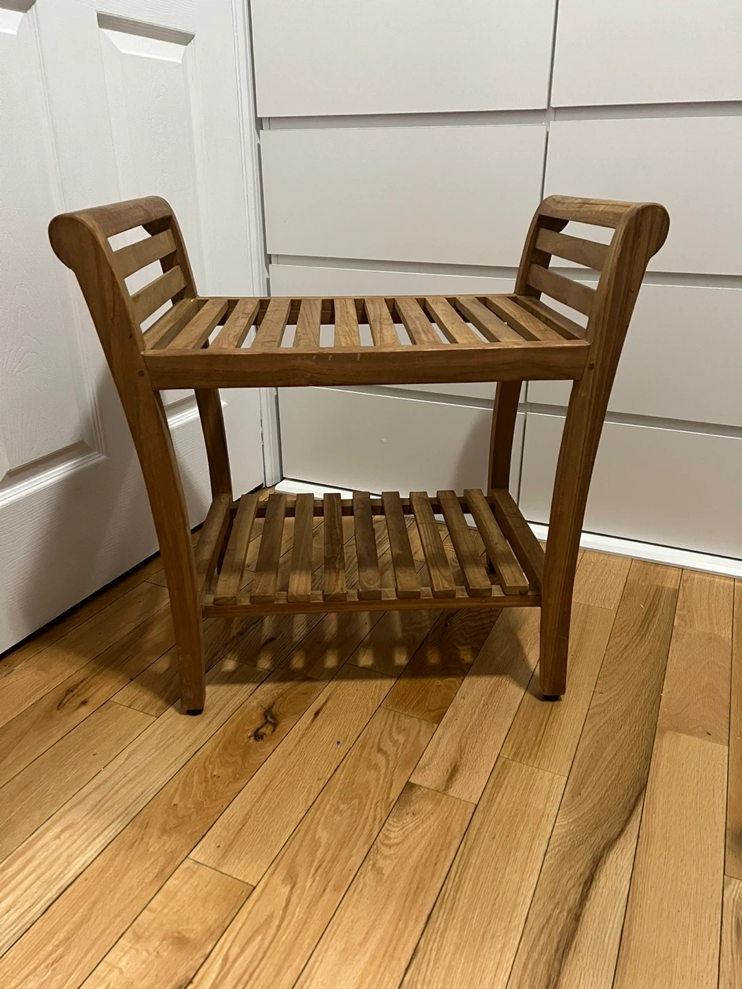 This wooden bench is made of durable hardwood. It features a slatted seat and a lower shelf for storage. It's perfect for use in a shower or bathroom!