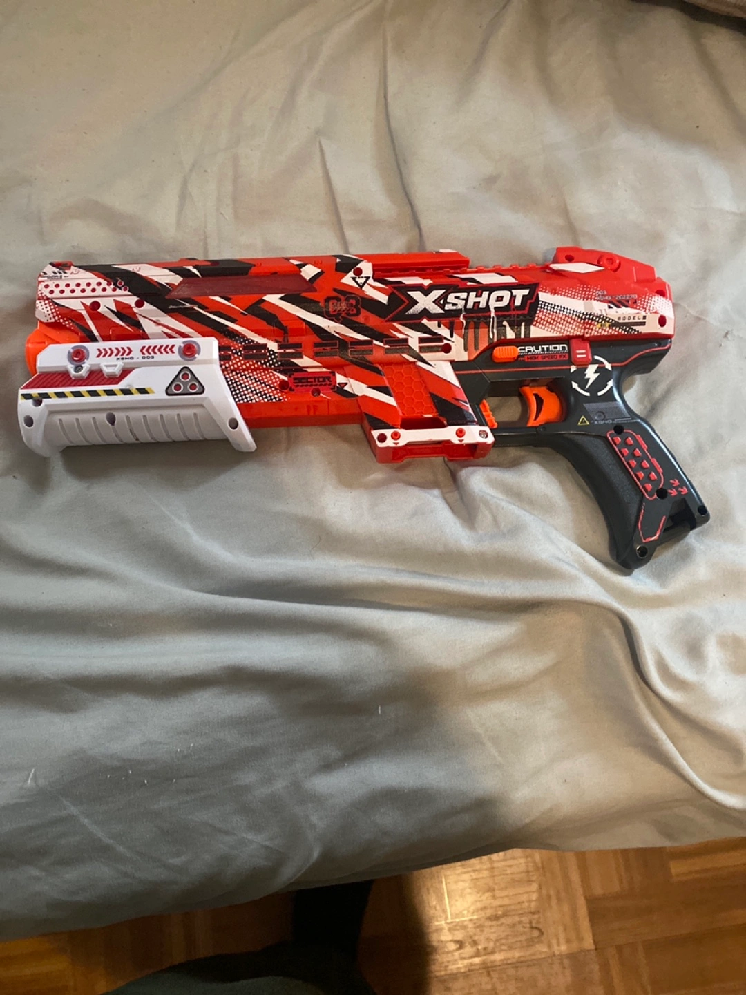 Red and white toy gun. Features a tactical stock. Looks like a futuristic design. Good condition.