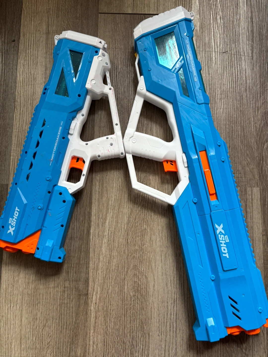 Selling two X-Shot Motor Soakers water guns! They are blue, white, and orange. Ready for some summer fun!