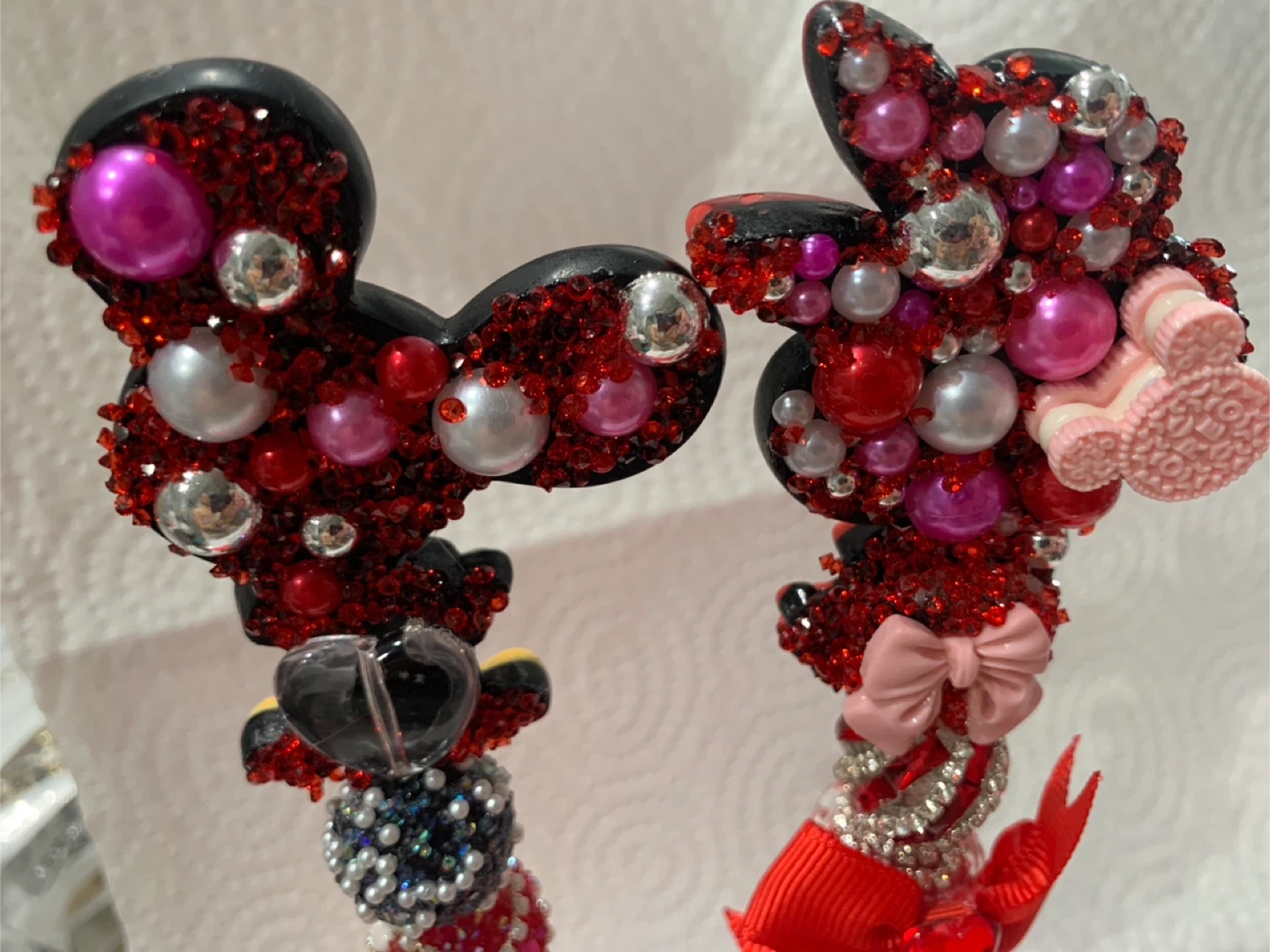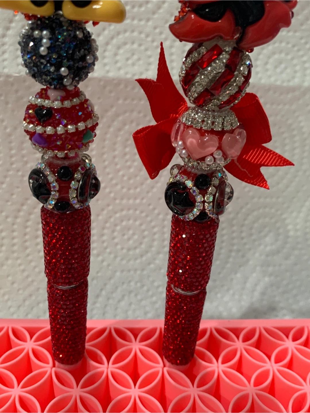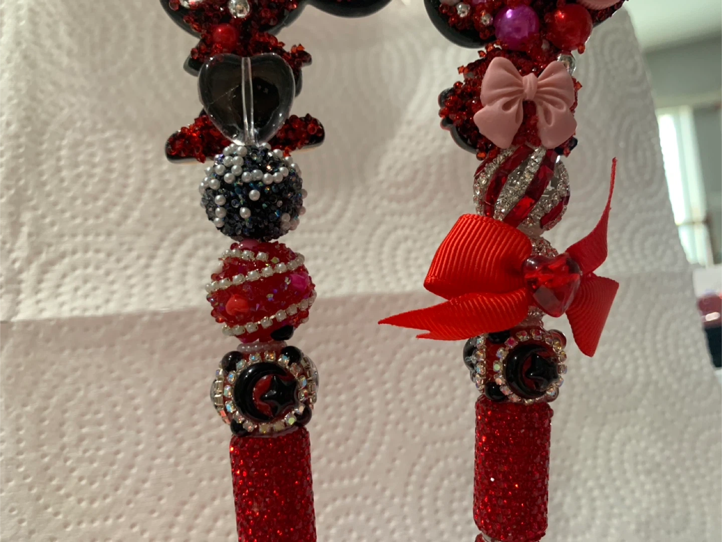 These are two decorative items fancy pens featuring Mickey and Minnie Mouse figures. They're covered in red glitter and adorned with various beads and rhinestones. Each pen has a unique charm and sparkle!