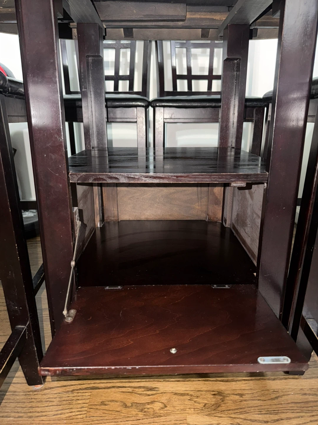 Dark wood dining table with six chairs. The chairs have black leather seats. The table has a storage shelf underneath. The middle part of the table can be removed & it turns into a round table too.
