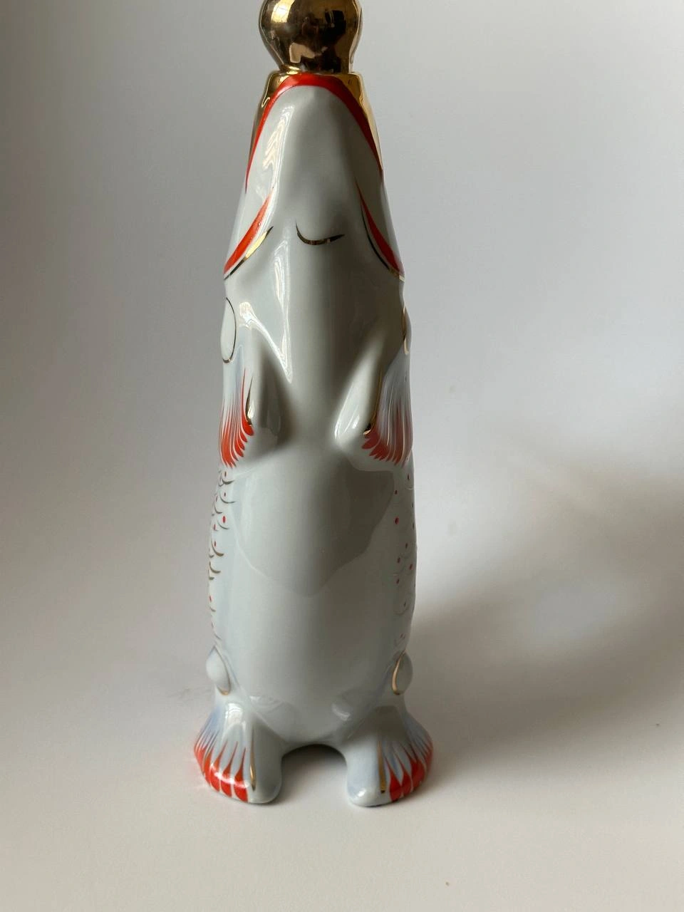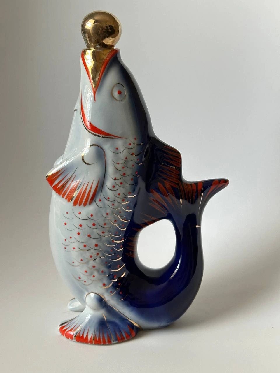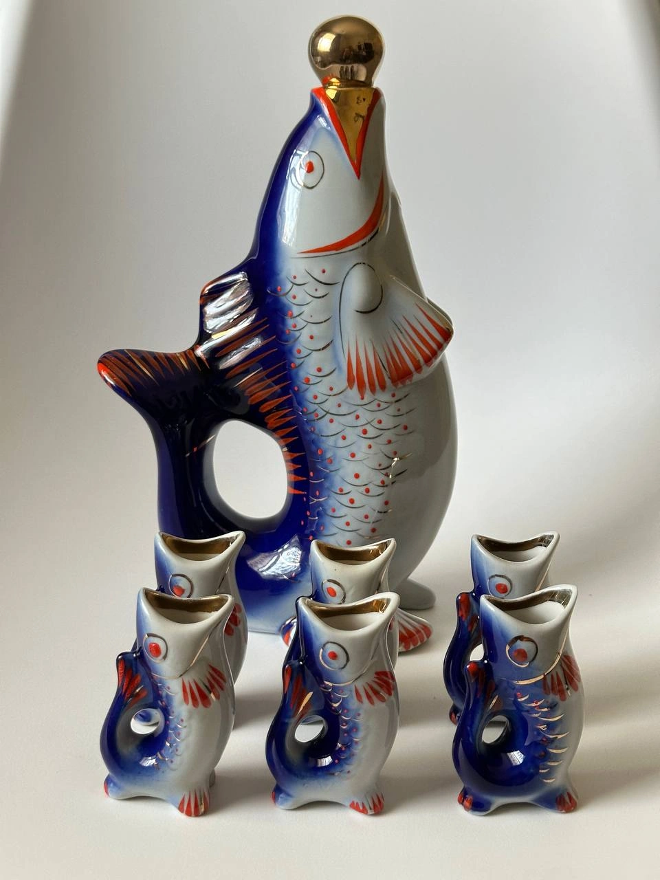 Selling a vintage fish decanter set. It includes the decanter and six matching shot glasses. The decanter is shaped like a fish standing upright, with a gold-colored ball on top. The set features a blue and white color scheme with red and gold accents. It's a unique and eye-catching piece!