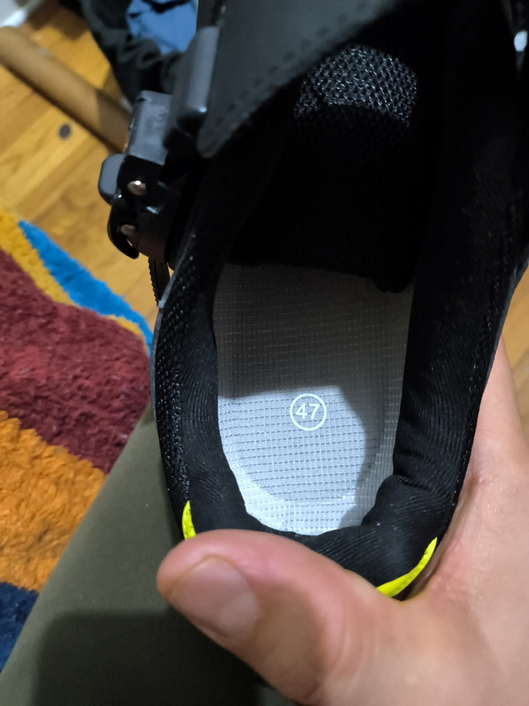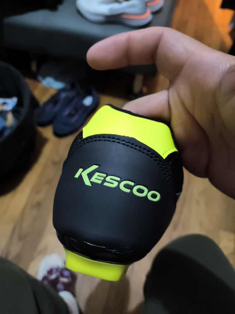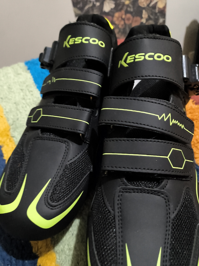Selling a pair of KESCOO cycling shoes in size 47. They're black with neon green accents and have a velcro strap closure. Perfect for your indoor or outdoor cycling needs!