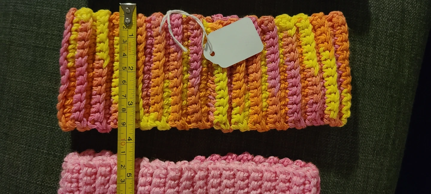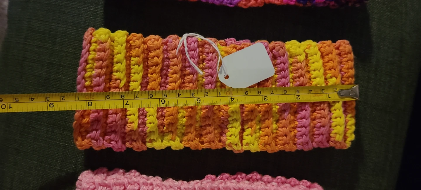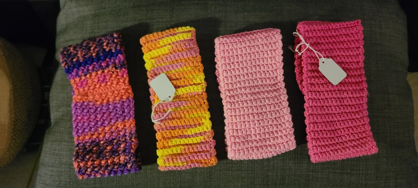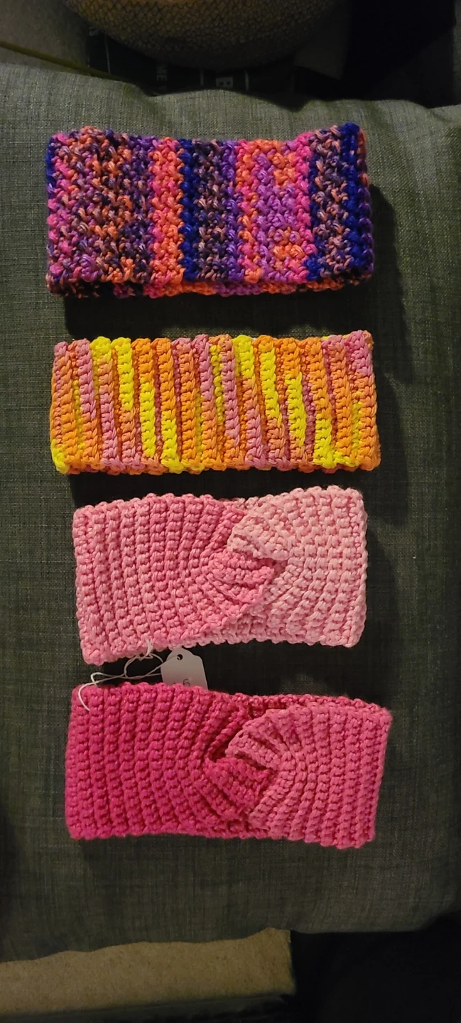 I have a few handmade knitted headbands for sale! They are all different colours, and about 4 inches wide. Great for keeping your hair back or adding a pop of colour to your outfit